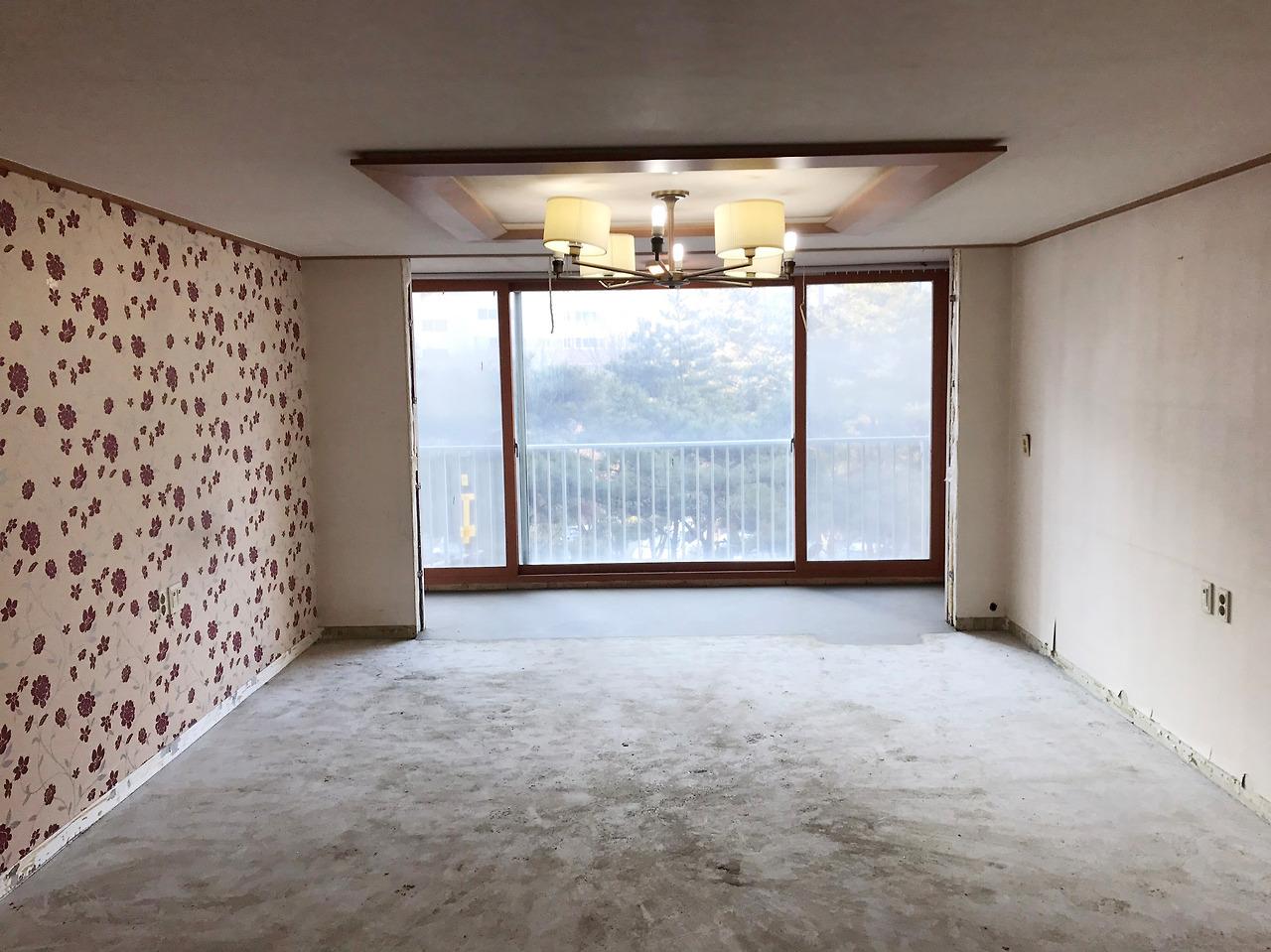 오랜 연식이 느껴지는 체리색 몰딩과 문틀, 꽃무늬 패턴의 벽지, 거기에 셰이드 몇 개가 사라진 샹들리에 조명 때문에 낡고 좁아 보이는 거실 공간이 새롭게 바뀌었습니다.