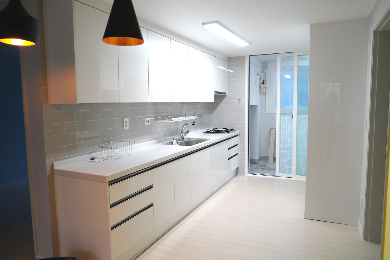 화이트톤으로 깔끔하게 꾸며진 일자형 주방은 조리 동선이 간편할 뿐만 아니라 심미적인 아름다움까지 느낄 수 있는 공간이 되었습니다.