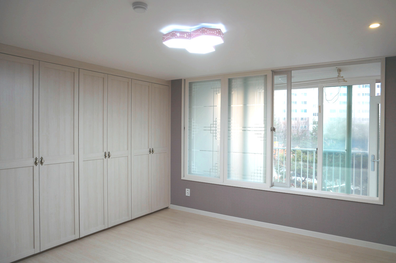 생기 있고 젊은 분위기의 공간으로 연출하기 위해 다른 공간과 마찬가지로 무거워 보이는 체리색 몰딩은 화이트로 통일하고, 밝은 톤의 그레이 벽지와 마루를 시공하였습니다.