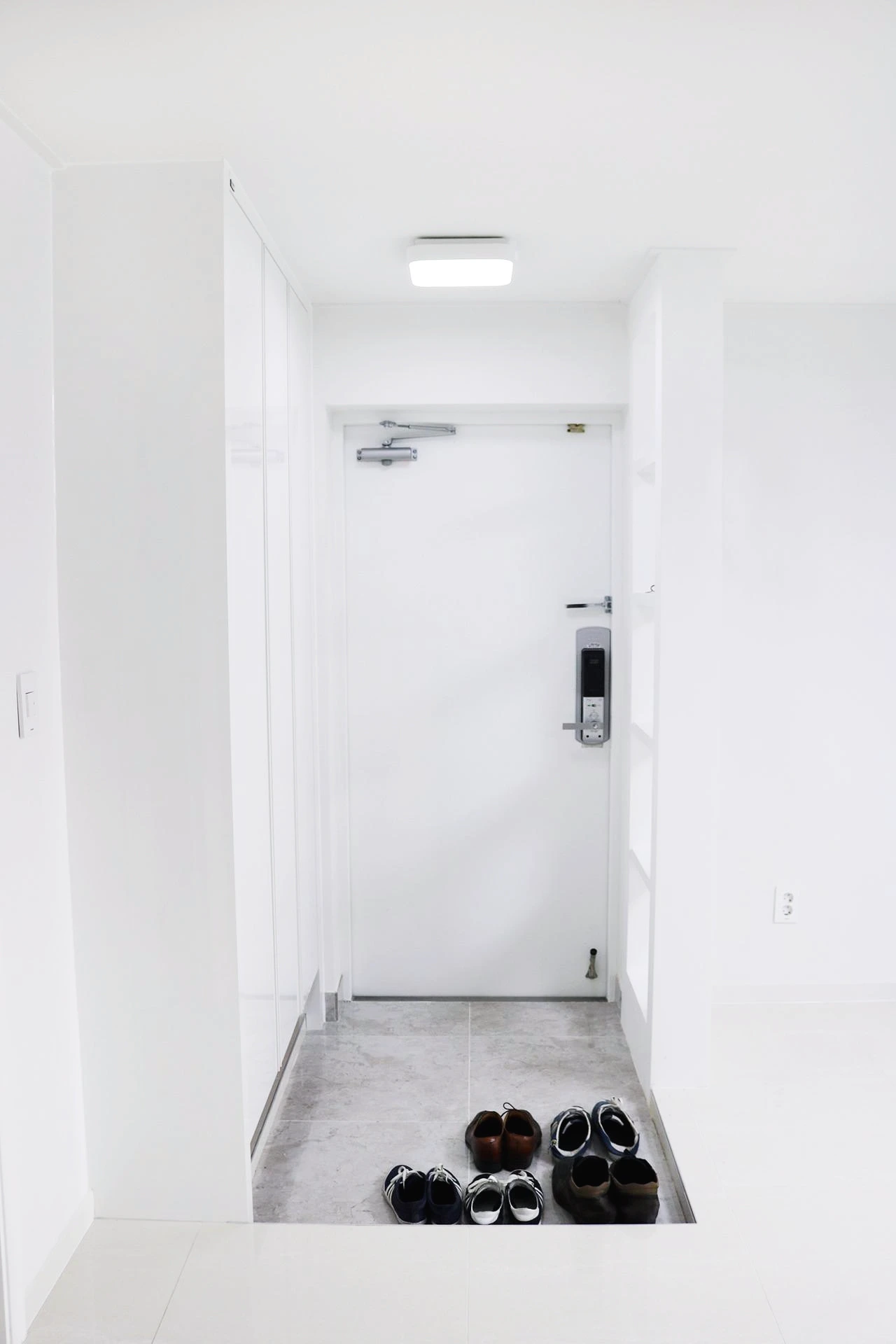 현관조명을 선택함에 있어서 어떤 색상으로 선택할까 고민하고 있나요? 밋밋한 공간에 포인트를 주고 싶다면 짙은 색상을, 이 곳과 같이 밝고 화사한 화이트 인테리어에는 확장성을 느낄 수 있는 화이트 색상의 조명을 추천합니다.