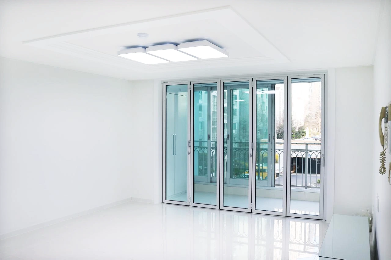 거실에서 발코니로 향하는 문은 일반적으로 시공되는 ‘새시 도어(Sash Door)’가 아닌, ‘폴딩 도어(Folding Door)’를 설치했습니다. 실내공간에 멋스러움을 선사하는 것은 물론, 필요에 따라 베란다 도어를 한쪽으로 정리하여 베란다를 확장형처럼 사용할 수 있어 편리한 아이템입니다. 특히 베란다에 홈카페 또는 홈바 연출 계획을 가지고 있다면 더욱 더 추천합니다.