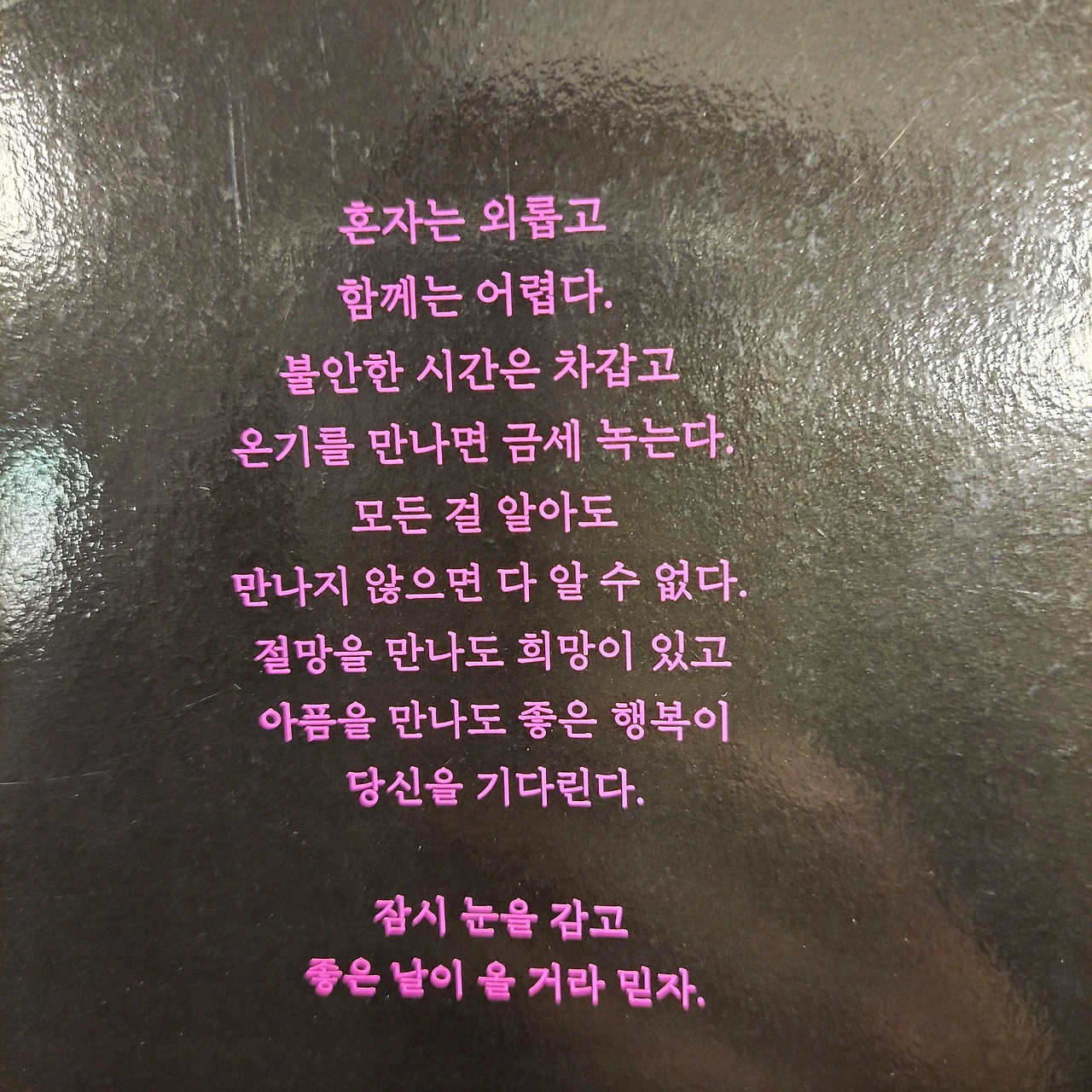 "혼자는 외롭고 함께는 어렵다. 불안한 시간은 차갑고 온기를 만나면 금세 녹는다........ 아픔을 만나도 좋은 행복이 당신을 기다린다."