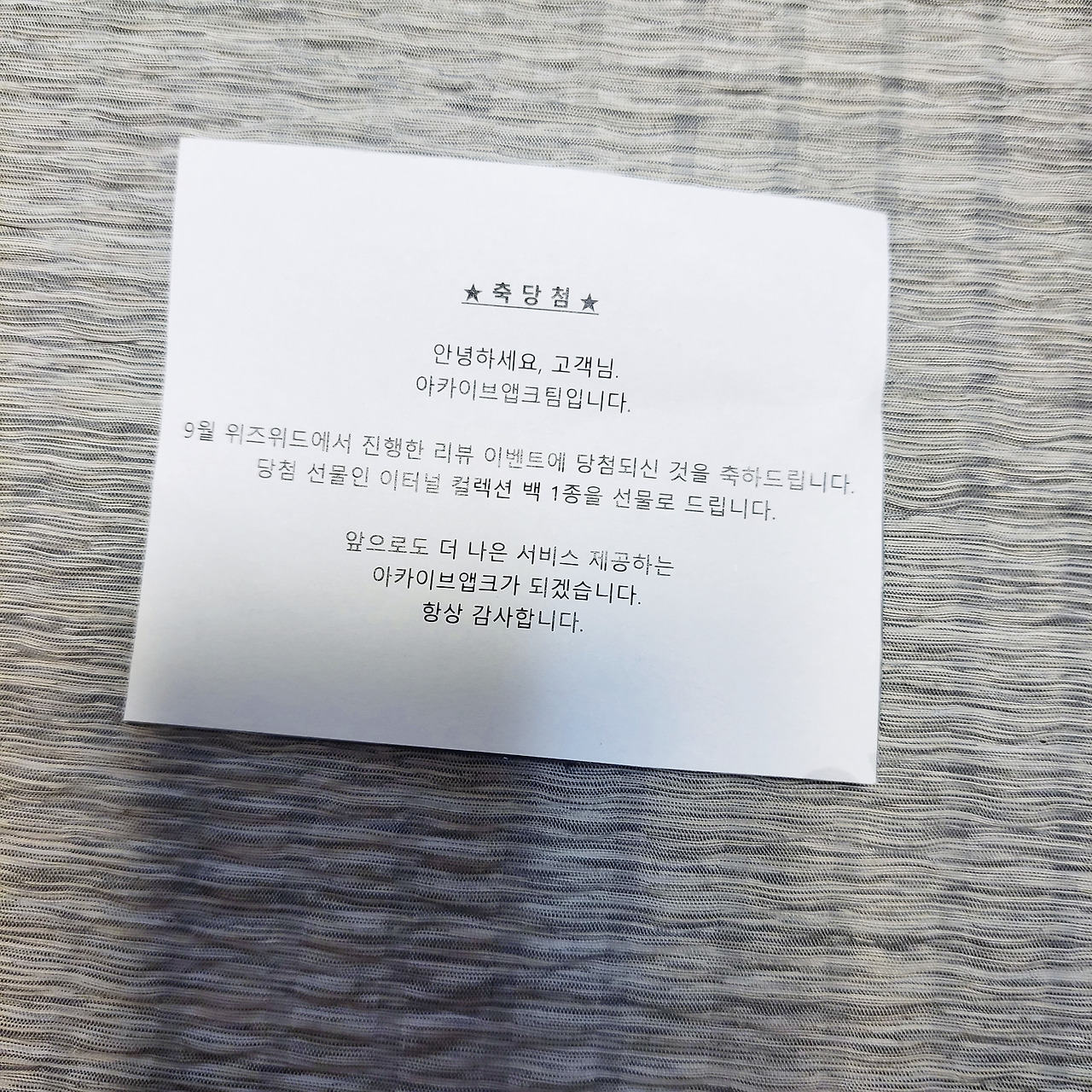 행운이란 뭘까. 생각지 않은 선물, 이벤트에 당첨되는 것. 아예 아무것도 기대하지 않고 아무 행동도 하지 않았을 때도 물론 행운이 다가오겠지만, 1%라도 무언가 기대를 하고 소망을 품고 행동을 했을 때 행운도 더 다가오지 않을까. 가방이 당첨되는 일은 생전 처음 있는 일이지만 평범한 일상에 꽤나 기분이 좋은 일이었다. 앞으로도 무언가 있으면 재미나게 도전하고 기대해봐야겠다 싶다.