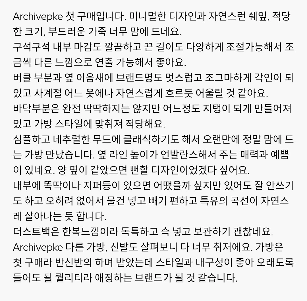 얼마 전에 한 쇼핑몰에서 가방을 하나 샀다. '무난하고 깔끔하고 편안하고 실용적이지만 스타일이 있는' 검은색 가방을 원했다. 원하는 것도 많지만 한 마디로 한다면 꾸안꾸 미니멀 느낌이랄까.