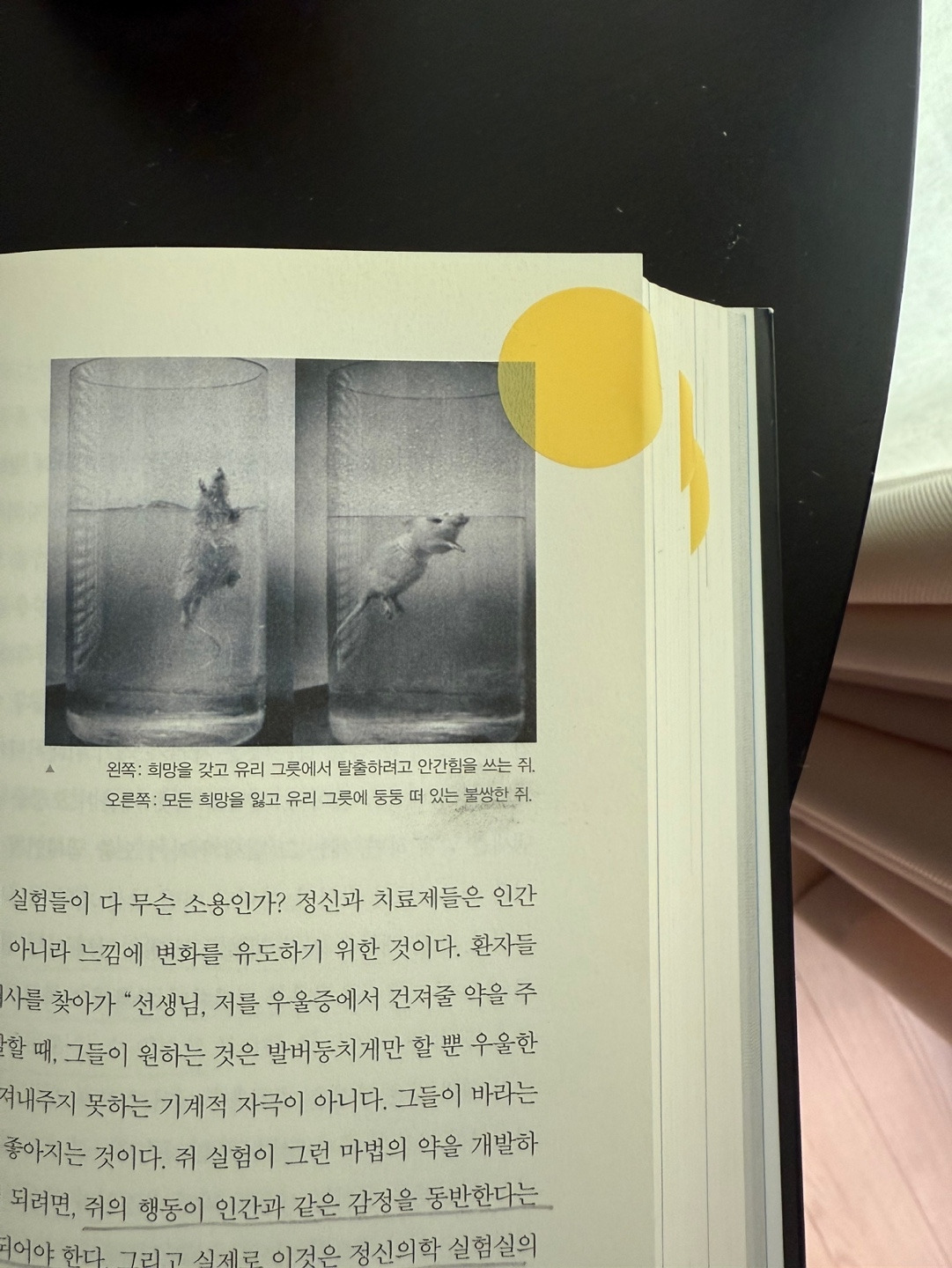 나는 이 사진을 볼 때마다 울컥한다. 유발 하라리의 <호모데우스>에 실린, 우울증 약 개발을 위한 생쥐 실험 사진이다. 물에 빠진 쥐들은 평균적으로 15분을 왼쪽 사진처럼 허우적거리다가 이후 오른쪽 사진처럼 체념한다고 한다. 시간만 흘렀을 뿐, 똑같이 물에 빠진 상황이다. 그런데 열심히 노력하던 쥐가 체념하면서 뇌에서 어떤 변화가 일어났을까? 바로 그때 체념하도록 뇌에서 분비되는 호르몬을 차단하는 게 바로 우울증 약이다.