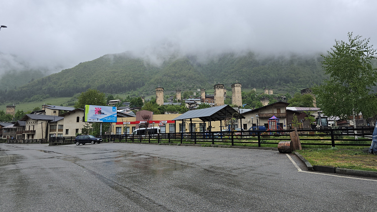 우비를 둘러쓰고 동료들과 메스티아 시내에 들어서니 '퀸 타마르 공항'가는 방향을 알리는 표지판이 눈에 들어왔다. 그 옆으로 스키 렌탈숍, 환전소, 은행이 줄지어 서 있다.