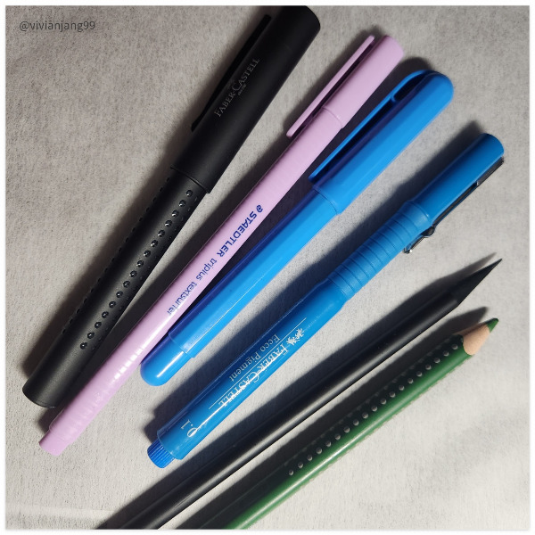 현재 제일 좋아하는 펜은 사진의 한가운데 있는 파버카스텔의 피그먼트 수성펜 0.1