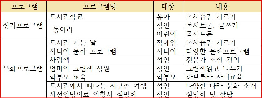 이를 위한 방법으로의 도서관의 독서. 문화프로그램은 아래와 같은 기능을 수행한다.