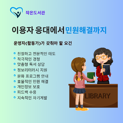 작은도서관 운영자의 업무 중 이용자 응대는 중요한 업무이다.