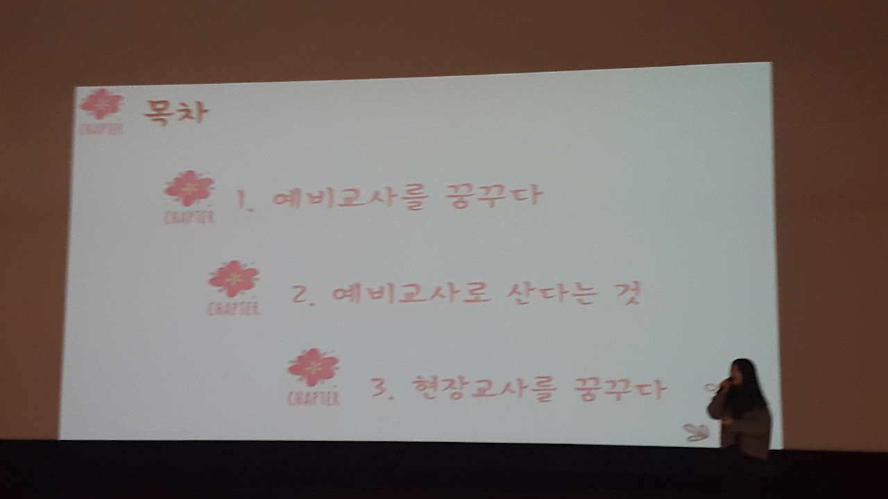 예비교사인 박정은 선생님의 발표에 입이 딱 벌어졌다. 부끄럽지 않은 교사가 되기 위해서 아주 많은 활동들을 하며 준비를 하고 있는 모습이 놀라웠기 때문이다. 멋지다는 생각이 들었다. 그렇게 일찍부터 열정적으로 고민하며 준비하는 선생님들이 많으니 현장에도 '실천하는 교사'들이 늘어날 것이 기대가 되었다.