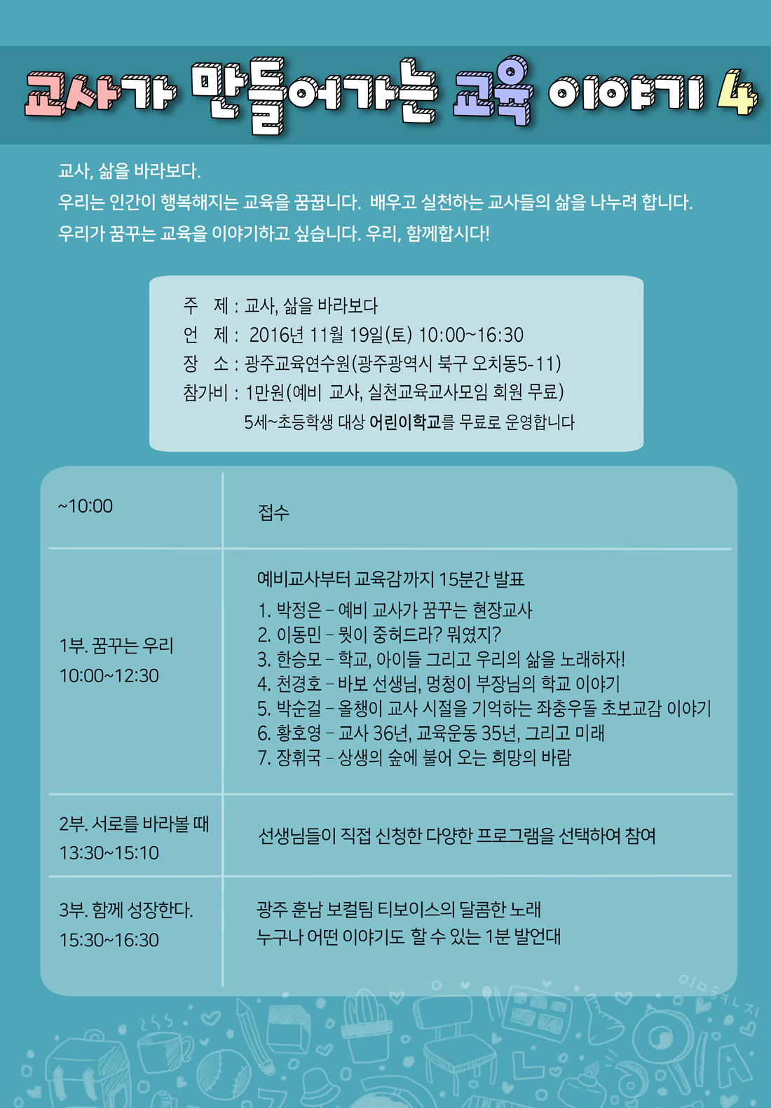 너무 멀어서 고민하다가 갔던 실천교육교사모임 네 번째 이야기, 광주 편. 장시간 이동을 해서 그런지 금요일부터 두통이 너무 심했다. 아프지 말라고 스스로에게 주문을 걸며 갔는데, 안 갔으면 어쩔 뻔했나 싶을 정도로 유익한 시간이었다. 오후 프로그램을 함께 하지 못해서 가장 아쉽긴 하다. 피로가 너무 심해서 점심을 먹고 일찍 나왔는데도 거의 하루를 꼬박 기절했다가 뒤늦게 글을 쓰기 시작했다. (그게 벌써 2주 전) 오후 프로그램으로는 차승민 선생님의 영화수업 신청했었는데 참여하지 못해서 아쉽다.