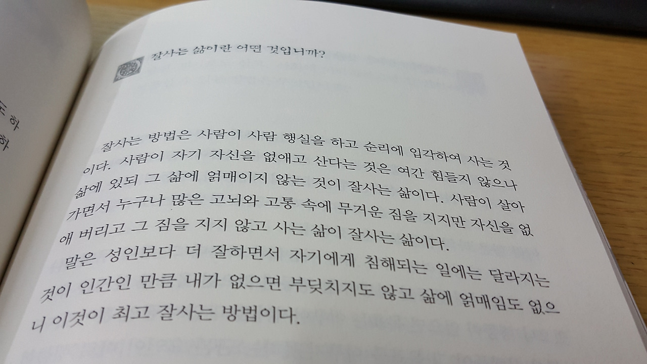 A. 잘사는 방법은 사람이 사람 행실을 하고 순리에 입각하여 사는 것이다. 사람이 자기 자신을 없애고 산다는 것은 여간 힘들지 않으나 삶에 있되 그 삶에 얽매이지 않는 것이 잘사는 삶이다. 사람이 살아가면서 누구나 많은 고뇌와 고통 속에 무거운 짐을 지지만 자신을 없애 버리고 그 짐을 지지 않고 사는 삶이 잘사는 삶이다.