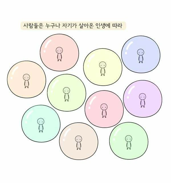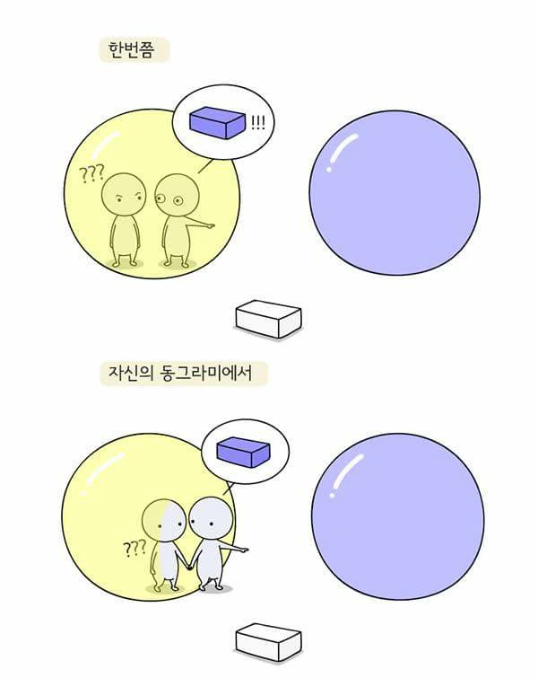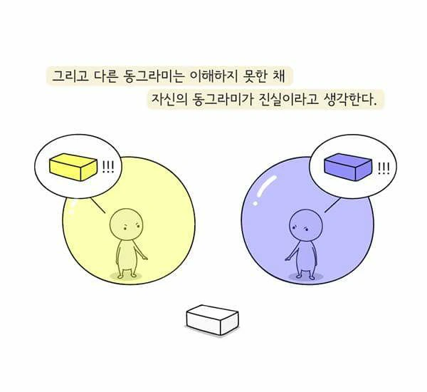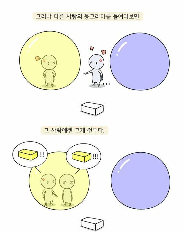 상대방의 입장이 되어보지 않고는 결코 상대를 이해할 수 없습니다. 그렇게 다투던 그와 결국은 같은 것을 보고 같은 것을 말하고 있었다는 것을, 입장만 바꿔보면 알 수 있습니다. 저 또한 마음수련 명상을 하고 보니 저와 의견을 달리 했고 또 이해할 수 없었던 사람들도 더 나은 세상을 바라는 마음은 저와 똑같았다는 것을 알았습니다. 살아온 인생에 따라 동그라미 색깔이 다르기 때문에 오해가 생기는 것입니다.