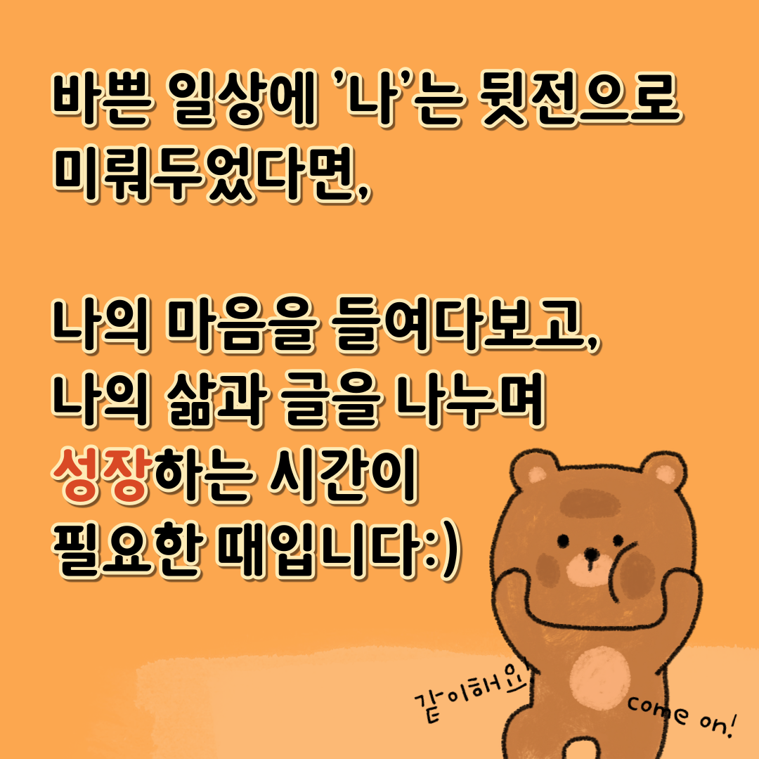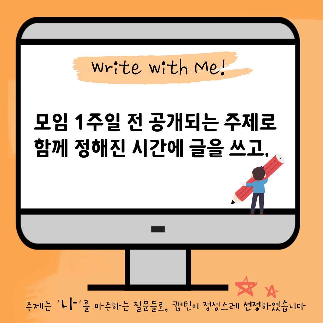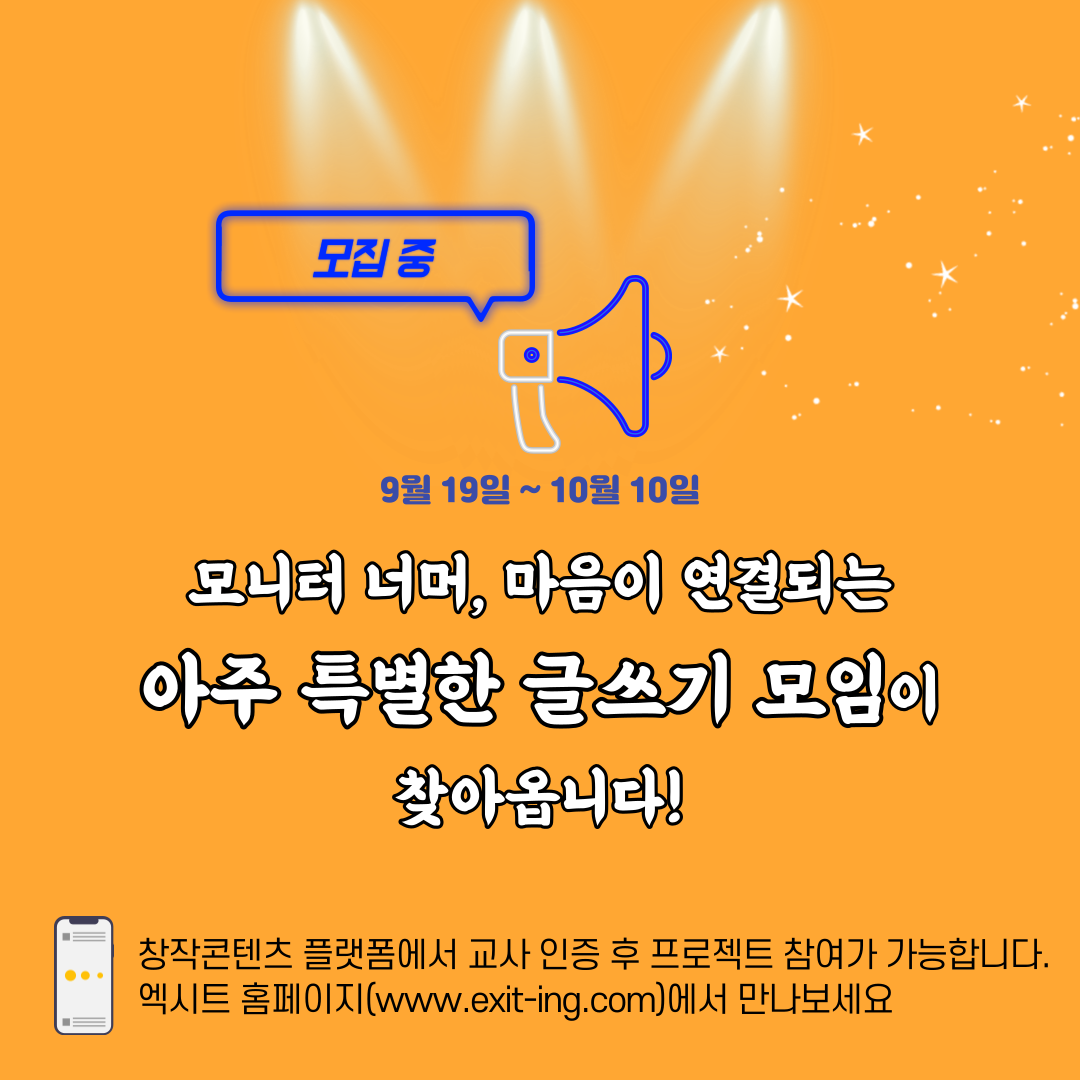 [엑시트의 프로젝트 라운지를 소개합니다] 바쁜 일상에 치여 '나' 자신은 뒷전으로 미뤄두었던 분! 함께 쓰고 읽으며 생생한 글쓰기 경험을 하고 싶으신 분!! 자신의 삶과 글을 나누며 성장할 용기가 있으신 분!!! 나를 돌아보는 온라인 글쓰기 모임에 함께해요! 정해진 시간에 ZOOM 화상 회의로 모여 캡틴이 정성을 담아 선정한 주제로 함께 글을 씁니다. ⠀ 여기에 하나 더, 이 프로젝트만의 특별한 점은 바로! 돌아가며 자신의 글을 소리내어 읽고 피드백을 나누는 시간이에요. ⠀ 낭독은 우리 몸의 여러 기관을 사용하게 만듭니다. 눈으로는 활자를 읽고, 입으로는 소리를 내며, 귀로는 나의 목소리로 내가 쓴 글을 듣게 됩니다! 글을 새롭게 바라볼 수 있는 색다른 경험이죠. 따뜻하고 존중 가득한 분위기 속에서 마음 편히 내 마음을 되돌아보아요. ⠀ 'Write with me'처럼 정해진 시간에 함께 글쓰고, 낭독하며 서로에게 따뜻한 독자가 되는 특별한 프로젝트 자세한 내용은 엑시트 홈페이지에서 꼭 확인해주세요! ⠀ 기간: 2020.10.06-2020.10.27 (총 4주, 주1회) 남은 신청 가능 인원: 3명 ⠀ 엑시트 홈페이지 (www.exit-ing.com) 에서 교사 인증한 뒤, 프로젝트를 만나보세요.