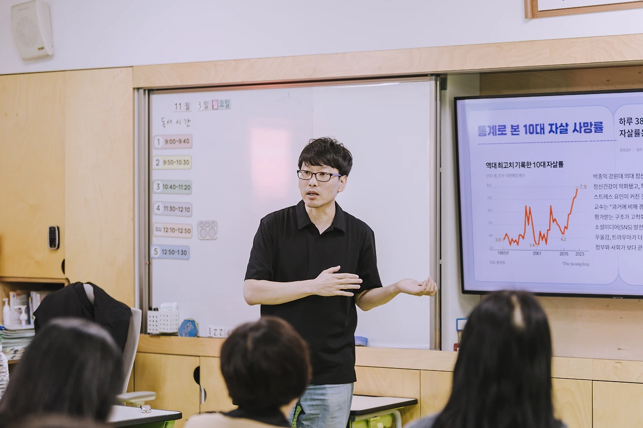 특수교사 박현주 선생님께서 진행해 주신 추모의 시간. 185는 2015년부터 지금까지 10년간 근무 중 스스로 생을 마감한 교사 수였다. 최근에도 안타까운 소식이 있었다. 교사가 아이의 배움과 교육에 집중하지 못하는 현실, 아프거나 지쳐도 쉴 수 없는 환경이 마음 아프다. 홀로 버티는 곳이 아니도록, 서로의 곁을 내어주자는 메시지. 우리는 모두 연결되어 있기에, 누군가를 돕기 위한 것이 아니라 연결된 나 자신을 지키는 일이라는 말씀이 마음에 남는다.