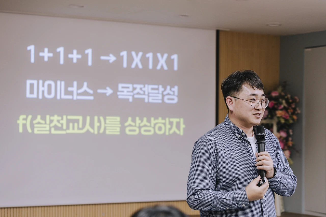 두 번째는 마이너스. 회비를 돌려주는(?) 기획으로 지역 모임 밴드를 활성화하고 서로의 삶에 관심을 갖게 되었다고 한다. 실천교사는 다른 단체보다 접근성이 낮다는 특징이 있다. 회원이 이야기하면 움직이는 모임인 것이다. 회원을 위해서 적극적으로 손해를 보자는 메시지를 전하셨다. 세 번째, f(실천교사). 비단 ‘회원’만을 대상으로 하지 않고 ‘회원이 될 사람’까지. 그러다 보면 함께하게 되기도 한다. 실천교사라는 함수가 있다면 ‘상상할 수 있는 모든 것’이라니 정말 매력적이다.