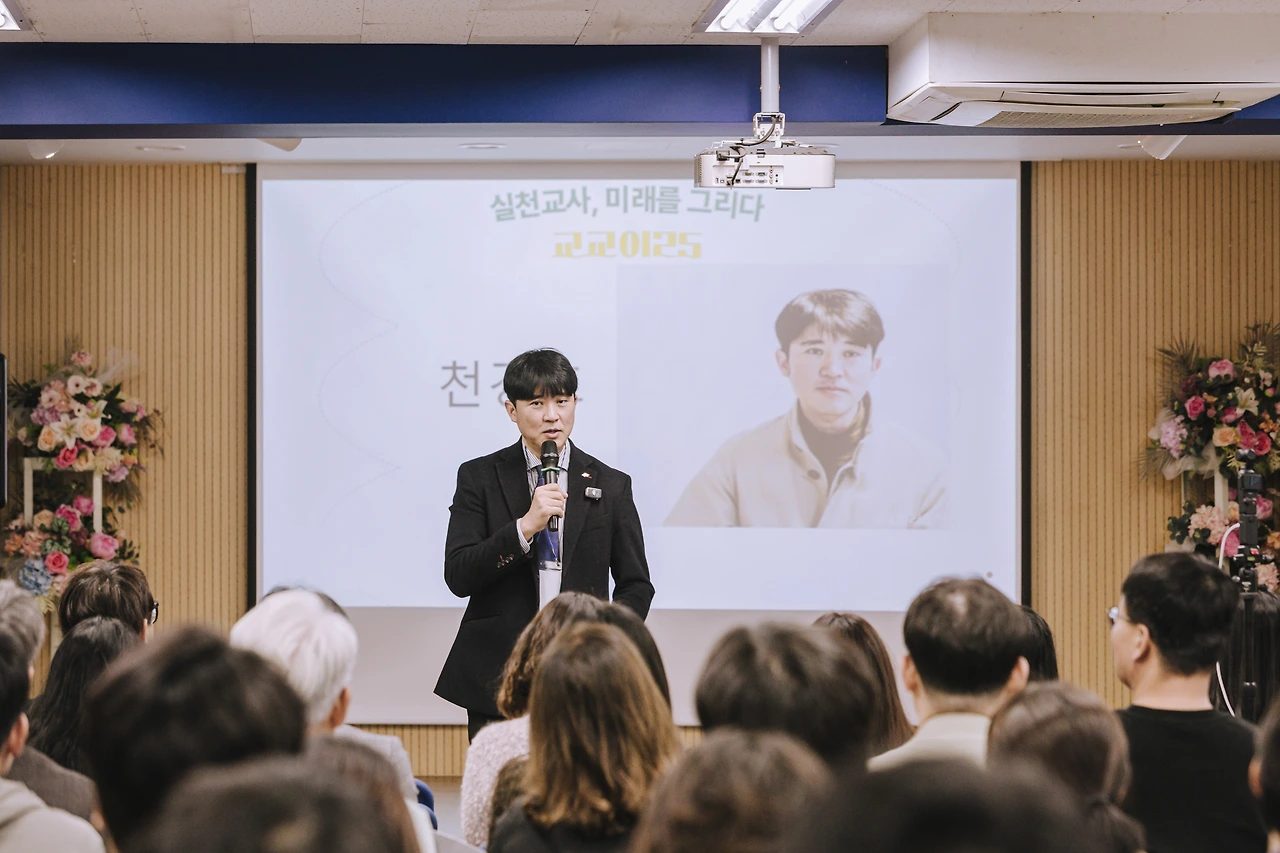실천교사, 미래를 그리다. 교교이 2025 첫 강연은 실천교사의 아버지(?) 정성식 선생님의 <실천교사, 어제와 오늘, 그리고 내일>이었다. 제목 그대로 실천교사의 어제와 오늘, 그리고 내일에 대해 정리해 주셨다. 실천교사는 2015년 10월 31일에 공식 출범 후 2016년 창원에서 출범식을 했다. 그 자리에 있었기에 교실 속 작은 목소리들이 마침내 하나의 물결을 이루었다는 표현이 와닿았다. 그리고 교단의 현실에서 이 질문들을 던지신다고 한다. 이런 질문을 던지는 선생님들이 계신 곳이라서, 실천을 찾게 되는 것 같다.
