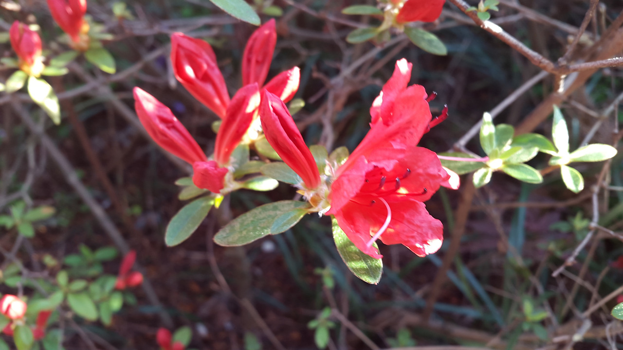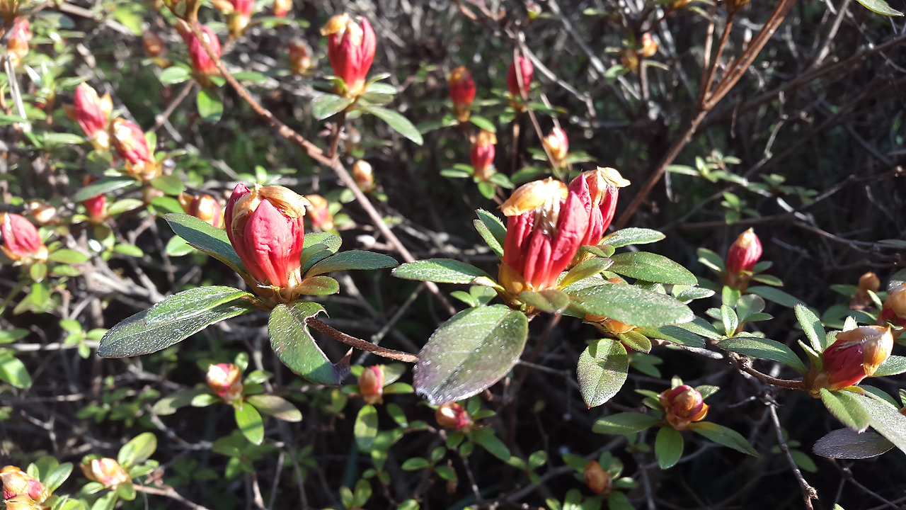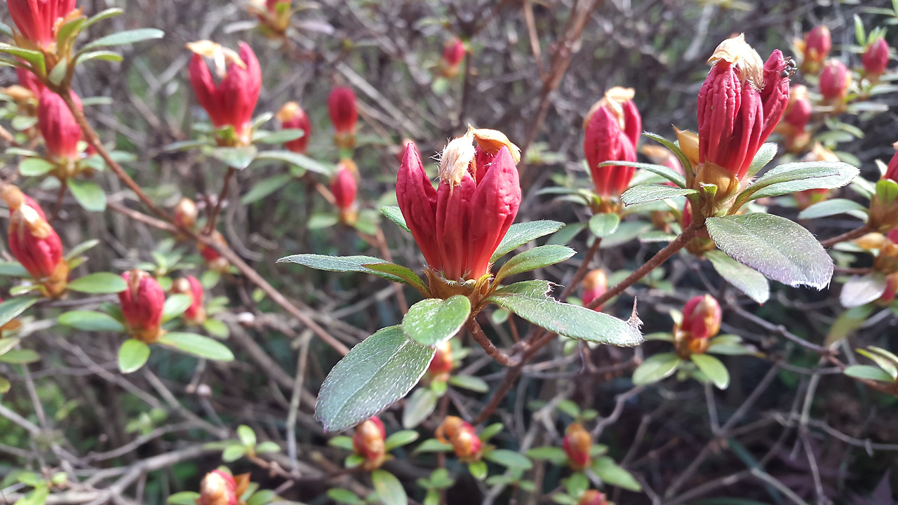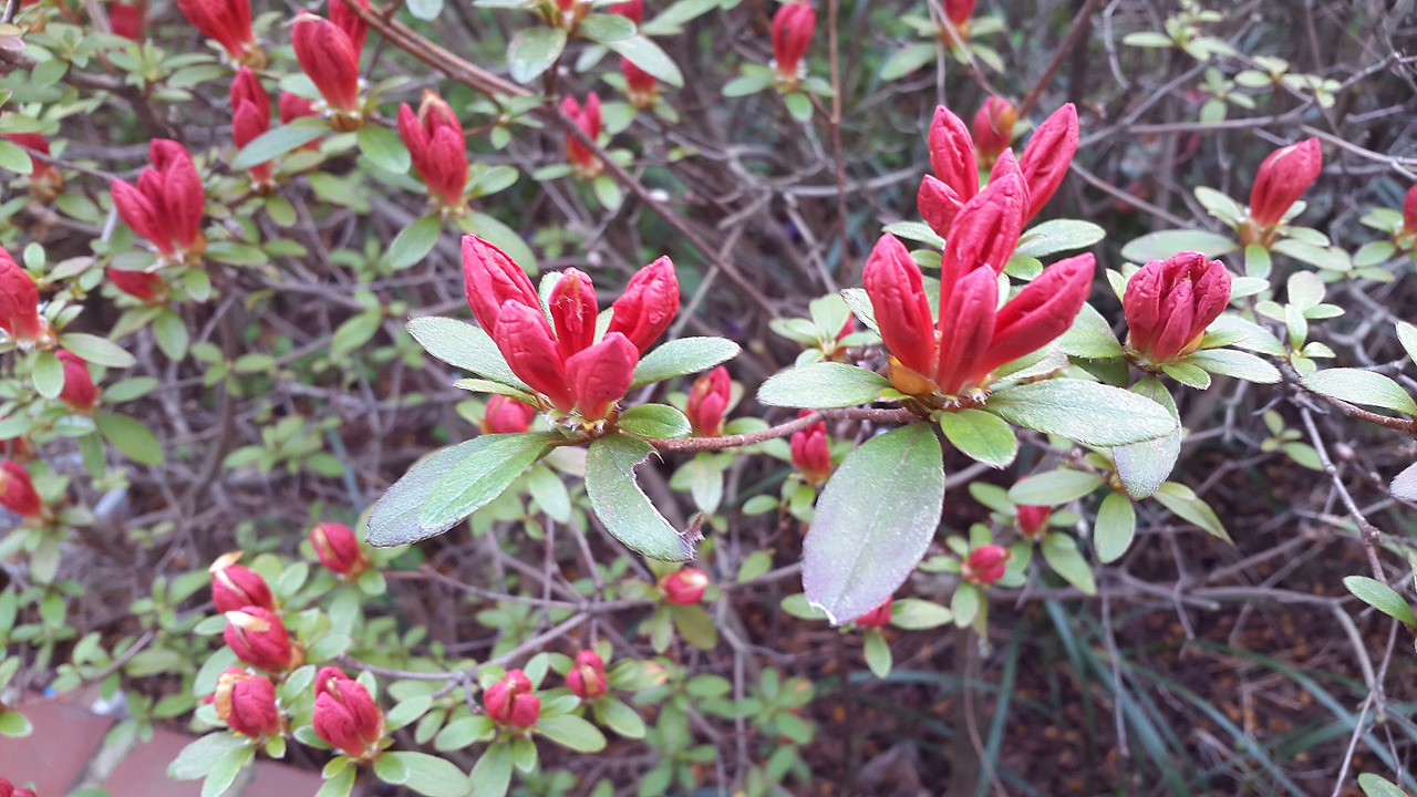 주위에 있는 꽃나무에 아무 관심도 없다가 어느 날 갑자기 화사한 색깔의 꽃이 만발한 것을 보고 시선을 준다. '이런 꽃이 있었나?' 새삼스레 놀라며 지나치지 못하고 사진도 찍는다. 적어도 지금까지의 나는 그랬다. 지난 해 5월에 나는 활짝 핀 영산홍에 반해서 화단 옆에 서서 내 얼굴이 함께 나오게 사진을 찍었었다. 올해도 봄이 되니 그 아름다움이 그리워서 자연히 앙상한 가지뿐인 화단에 계속 시선이 갔다. 어서 만개하기를 기다리며 꽃이 피기까지의 순간을 담아보기로 했다. 다른 곳 영산홍은 다 만개했던데 내가 지켜보며 기다리고 있는 화단의 영산홍만 유독 늦게 피었다.