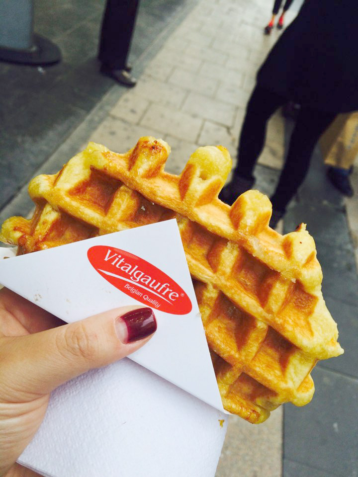 나는 2.45유로 와플을 먹었는데, 와. 와플의 신세계다. 정말 이럴 순 없었다. 이때까지 내가 먹어 온 와플들은 가짜였다. 내 인생 와플. 아, 와플의 본 고장이니 당연한 것인가. 최고였다. 위치는 sleep well에서 오줌싸개 동상이나 그랑플라스로 가기 위해 나오는 큰 대로변에 있었던 걸로 기억한다. 사람들이 줄을 많이 서 있고 훈남 직원들이 주문을 하면 와플을 맛있게 구워준다. (벨기에 남자들이 진짜 잘생겼다. )