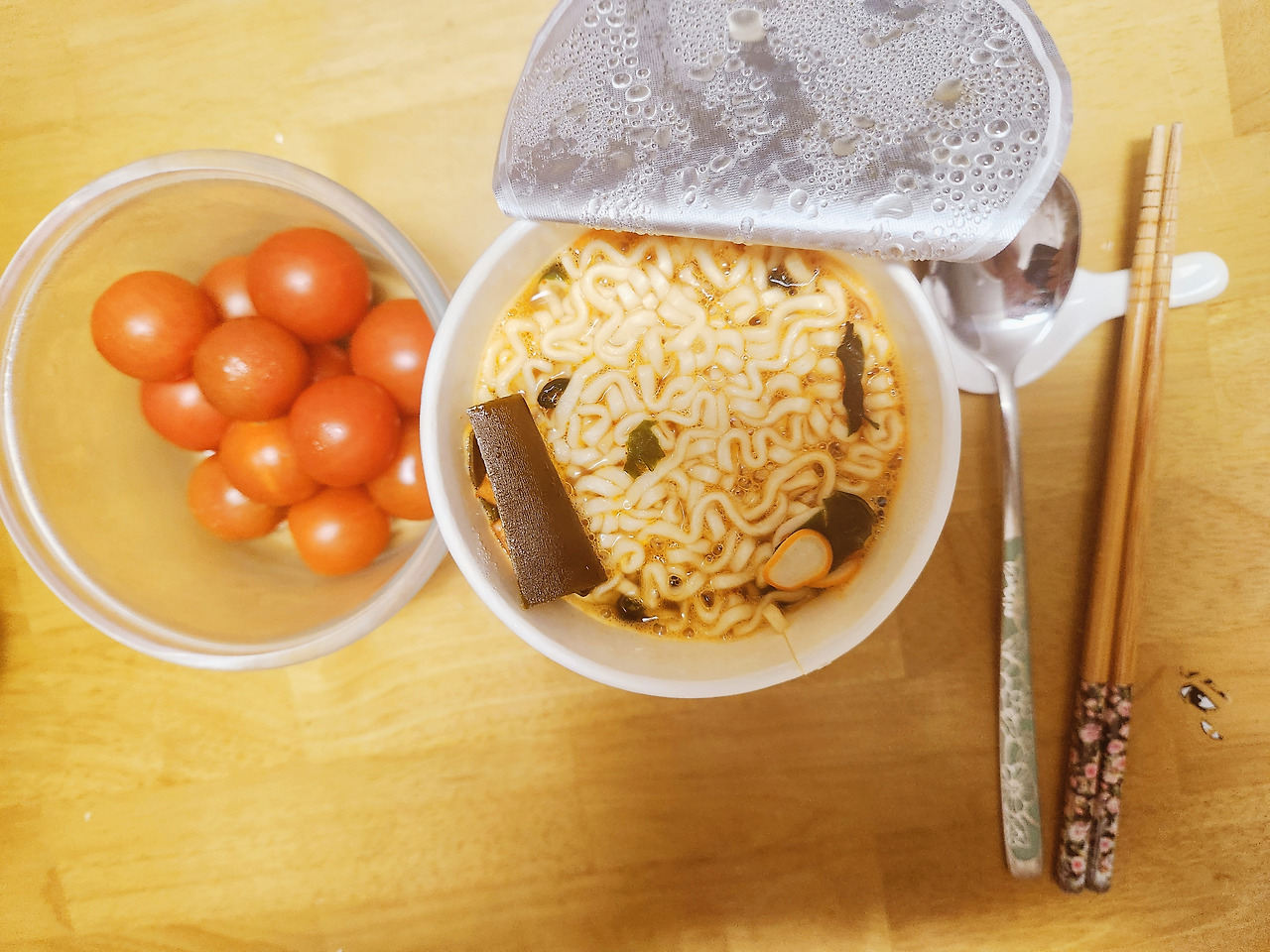 어제는 건강식으로 먹고 싶다고 적채, 양배추 그리고 당근을 호기롭게 잘라서 메밀면과 먹었는데 결국 너구리 컵라면에 뜨거운 물을 붓고 말았다. 아이는 계란후라이. 계란후라이 킬러여서 고맙다.