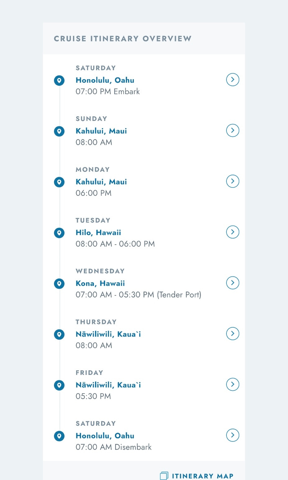 이 여행은 하와이 섬 4곳을 연중 7박 8일 동안 항해하는 유일한 크루즈로 신혼여행 또는 가족여행으로도 유명하다. 매일 밤마다 배가 다른 섬으로 이동하고 아침이면 목적지에 도착, 각 섬마다 고유한 문화와 아름다운 풍경과 하와이 로컬의 음식 문화를 접할 수 있다.