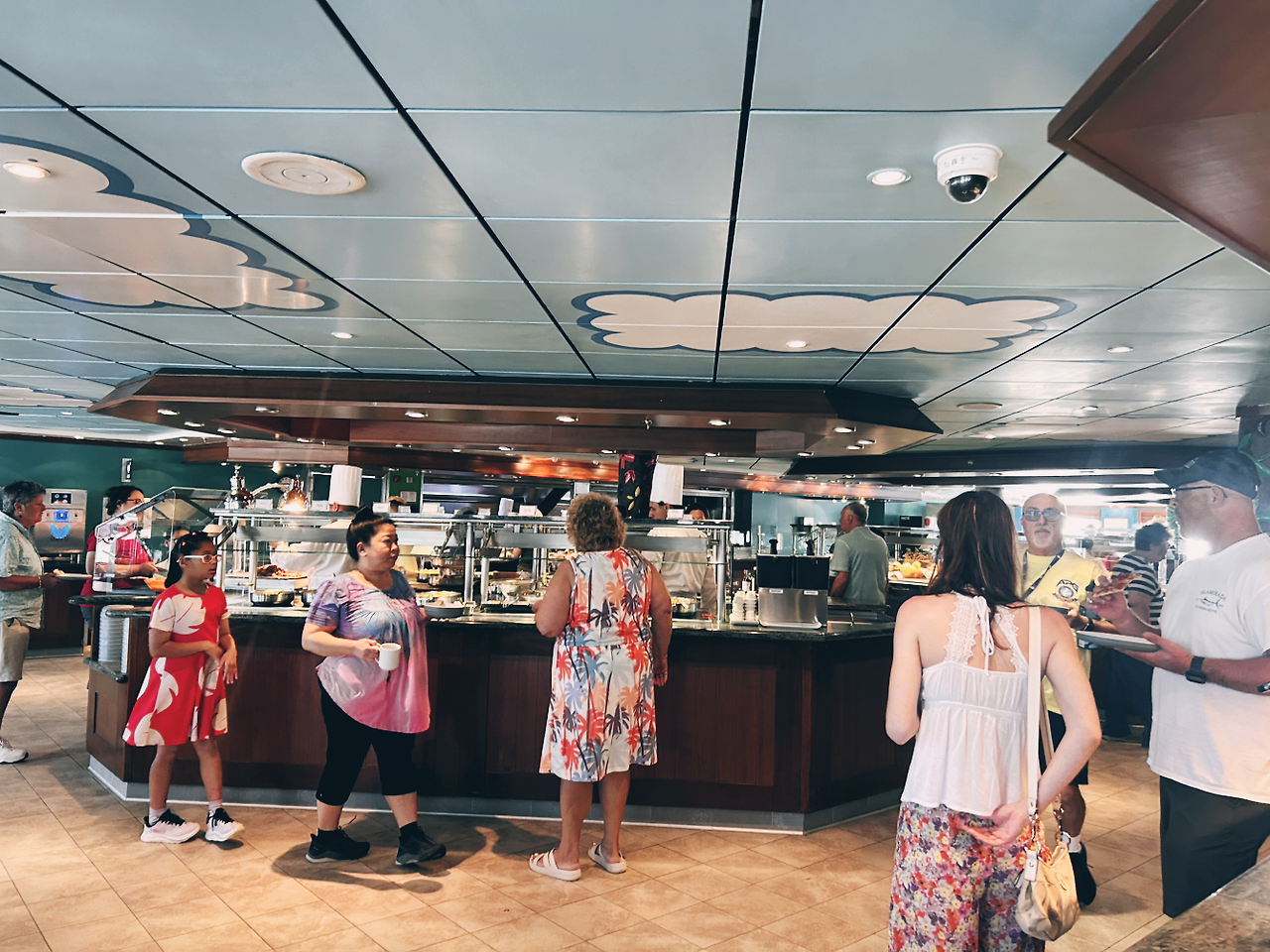Room에 도착, 짐 정리 후, 배를 구경 다니고 우선 저녁을 먹으러 갔다. 크루즈 안에 식당이 열 군데 정도 되는데 사람들이 가장 많은 Aloha Cafe로 갔다. 벌써 식사들 하느라 바쁘다.