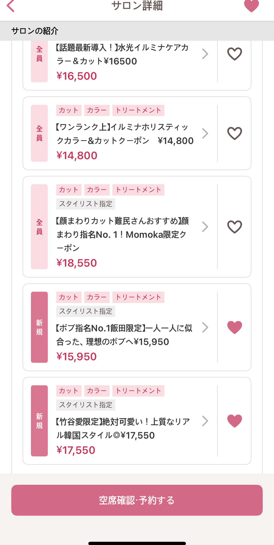 예약은 커트와 트리트먼트를 했는데, 디자이너가 힙해 보이고 스타일이 좋아 마음이 바뀌어 하트로 뿅 되어 있는 두 아이템 중 하나를 선택하기로 하고 미용사와 상의 후, ¥17,550을 선택했다.