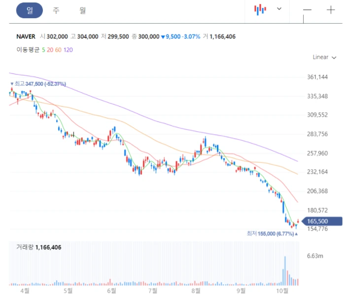 16만원대를 보이고 있는 네이버 주가는 52주 신저가를 경신했을 뿐만 아니라 2020년 4월 1일 이후 가장 낮은 주가 수준으로 올 초 대비 반토막 난 수준입니다.