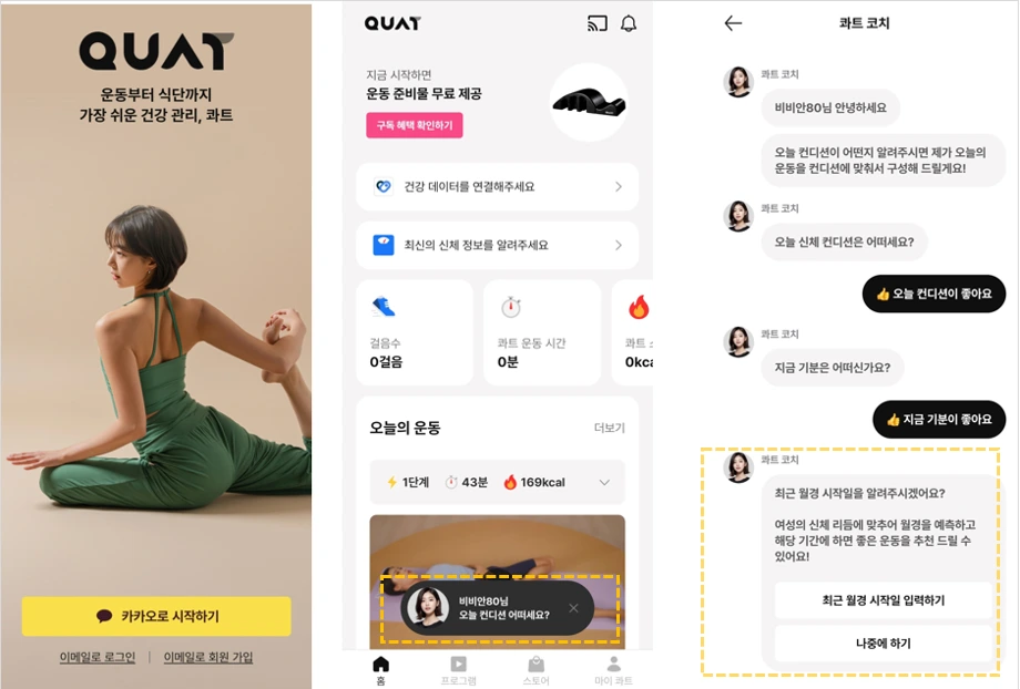 오늘 컨디션은 어떤지, 기분은 어떤지 묻고 여성의 경우 ‘생리 시작일’ 등을 묻게 합니다. 또한 건강 데이터를 연결해라, 최신의 신체 정보를 알려달라와 같은 메뉴가 보이면서 자연스럽게 이 앱을 시작하기 위한 개인의 정보를 적을 수 있도록 유도하죠.
