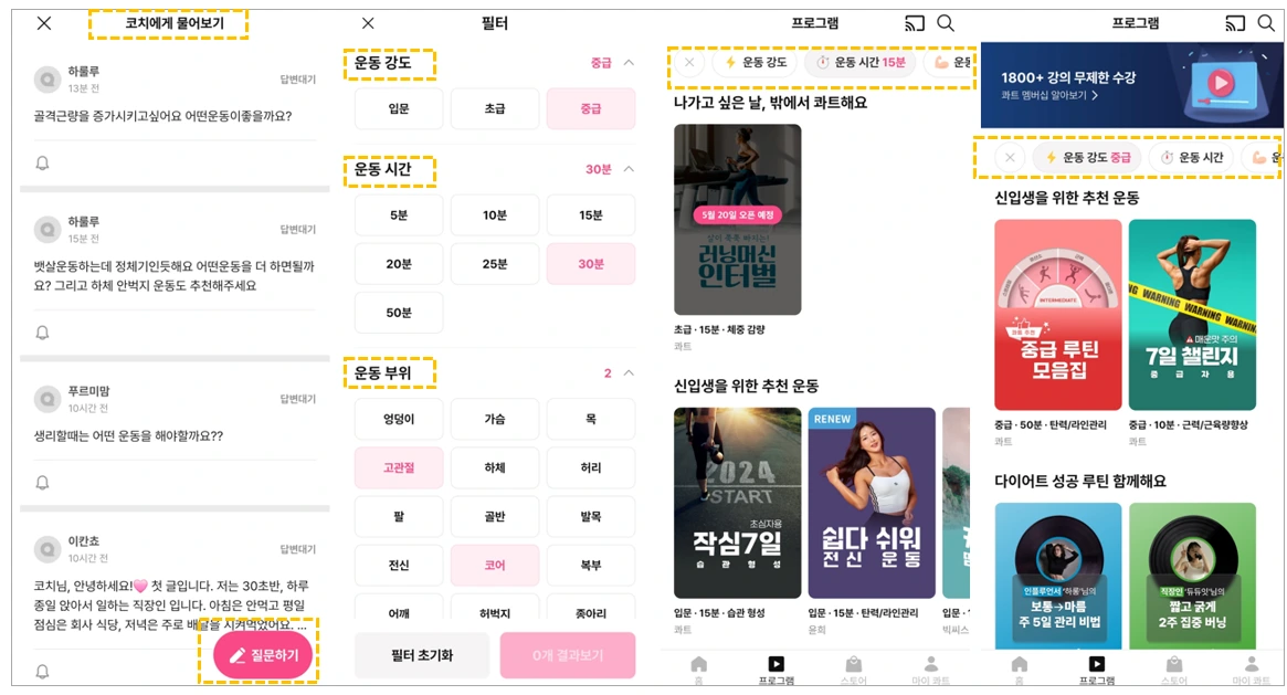또한 콘텐츠를 소비하기 전에 운동 강도, 운동시간, 운동부위, 난이도 등을 선택하게 되면 내가 선택한 필터값에 맞는 운동 콘텐츠를 제안해 주기 때문에 개인별 원하는 콘텐츠를 소비하면서 운동을 할 수 있게 되죠. 이 기능의 경우 소비자가 개인이 직접 선택하게 만들다보니 자발적인 운동으로 이끄는데 동기부여가 될 수 있습니다.