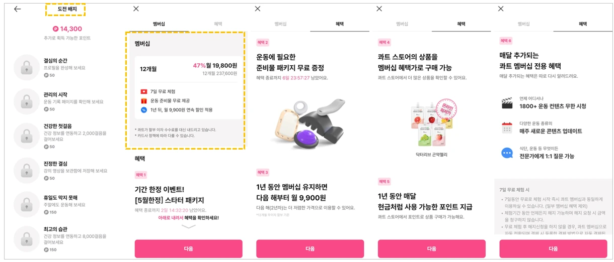 콰트는 이외에도 도전 배지 기능을 만들어서 고객들이 어떤 행위(프로필 완성, 건강정보 등록, 주말에 운동하기)를 할 경우 포인트를 적립할 수 있고, 해당 포인트로 커머스 탭에서의 제품을 구매하는 데 쓸 수도 있습니다.