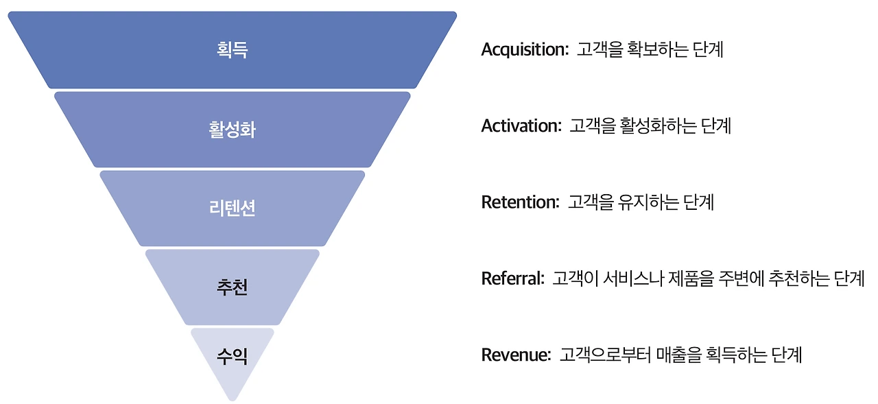 CRM 마케팅의 경우 미국의 액셀러레이터 500의 창업자인 데이브 맥클루어가 2007년에 선보인 AARRR 모델을 기본으로 하는 퍼널 전략이 많이 사용됩니다.