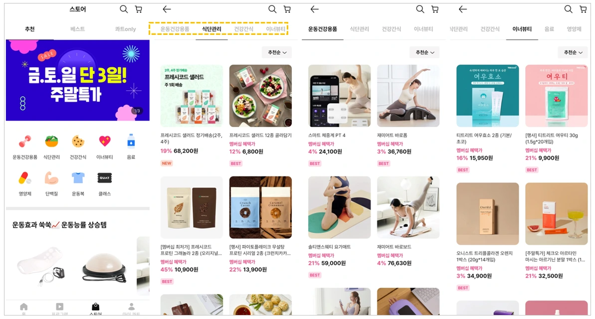 커머스 탭 활성화 전략의 경우 프레시코드를 인수해서 식단 부문을 내재한 것과 콰트 서비스 초반에 운동기구 판매 업체를 인수한 것, 그 외의 다른 제품 기업들과는 협력을 통해 입점 판매를 유도한 것 모두 쇼핑탭 활성화, 수익 개선에 중요한 역할을 하게 됩니다.