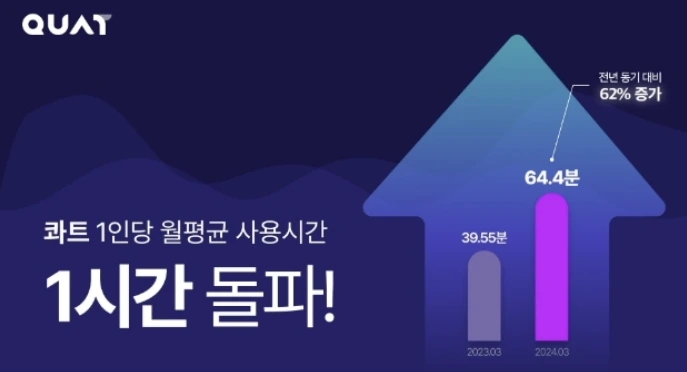 3번째 단계인 리텐션을 증가하기 위한 전략은 바로 ‘콘텐츠’ 입니다. 콰트는 꾸준히 콘텐츠 업데이트를 하는데요. 이로 인해 올해 4월 기준 1인당 월 평균 앱 사용시간이 1시간을 돌파했죠. 정확히 1시간 4분을 기록했다고 하는데요. 전년 동기대비 62%나 증가했습니다.