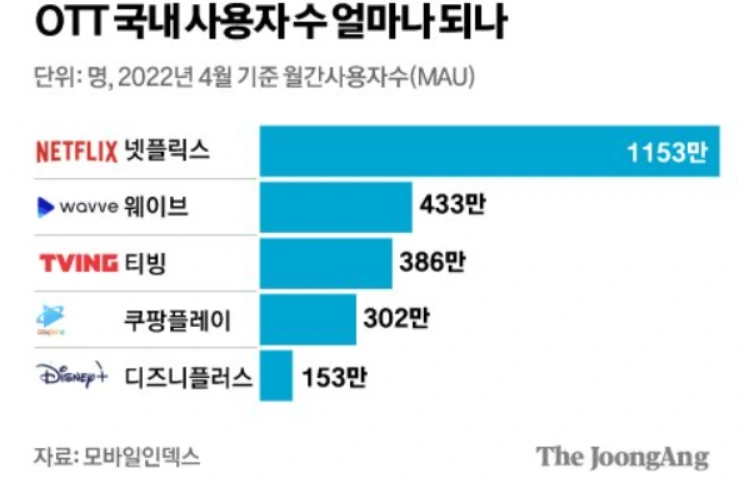 우리나라에서는 SKT와 지상파3사가 합작해서 만든 OTT인 웨이브가 있고, CJ ENM, 네이버, JTBC가 합작해서 론칭한 티빙 그리고 쿠팡플레이, 왓챠가 경쟁하고 있습니다.