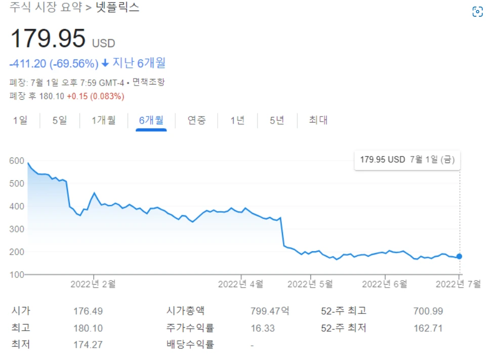 넷플릭스가 언제나 승승장구할 줄 알았는데 올해 1분기 유료 가입자가 11년만에 전년동기대비 20만명이나 감소했습니다. 시장에 심상치 않은 흐름을 보여주다보니 주가도 즉시 반응을 했죠.