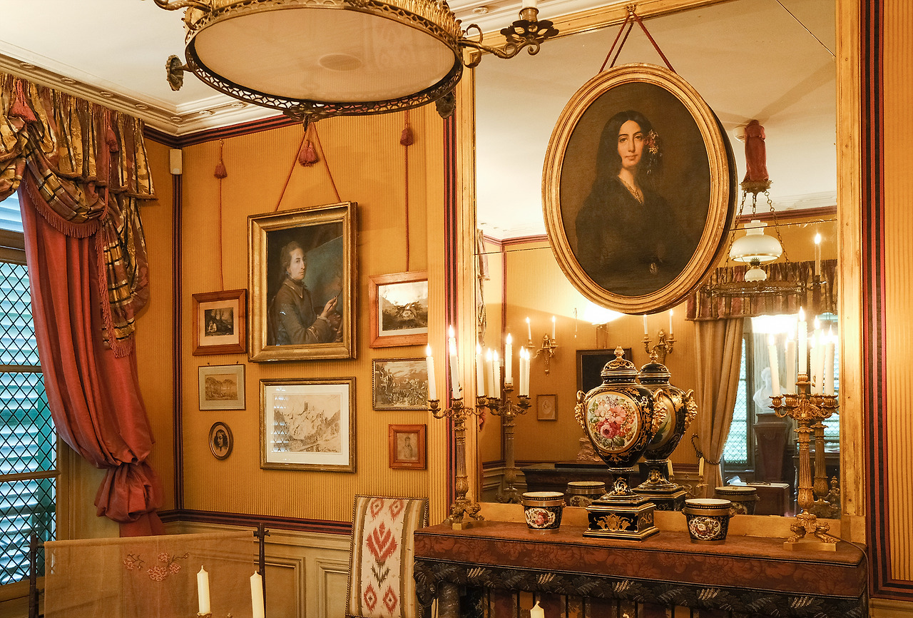 이어진 1층 공간에는 조르주 상드의 가구와 유품 그리고 그녀의 초상화가 걸려있다. 그녀는 셰퍼 부부를 정기적으로 방문해 많은 시간을 함께 했다고 한다. 여기 놓인 가구는 노앙 별장에 있던 것으로 두 사람은 쇼팽의 건강 회복을 위해 노앙에서 여름을 보냈다. 부슬거리는 긴 머리를 길게 늘어뜨린 초상화 속 상드는 우아하면서도 슬퍼 보인다. 우리에게는 오로르 뒤팽(Aurore Dupin)이라는 본명보다 조르주 상드라는 필명이 더 익숙한 작가이기도 하다. 그녀는 개성을 드러낸 19세기 여류 소설가 중 한 사람으로 손꼽히는데, 평소 남장을 즐겨 하기도 하고 자유연애로 세간의 화제가 되기도 했다.