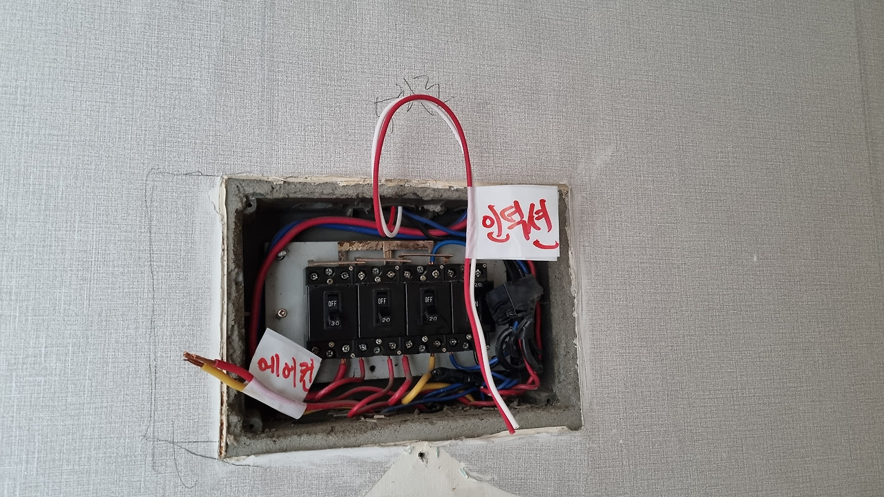 전기 작업에서 특히 우리 현장과 같이 오래된 아파트를 리모델링할 때 잊지 말아야 할 점은 예전의 생활방식이라면 감당하지 못했을 전기 용량의 전선을 따로 빼줘야 한다는 것이다. 우리는 전기 기술자분과의 협의 끝에 인덕션용 전선과 에어컨용 전선을 별도로 분리하고 이를 제어하는 누전차단기를 새로 만들어 넣기로 했다. 만약 이 작업을 하지 않았다면 인덕션을 켜면 조명이 나간다거나, 에어컨을 동시에 돌리지 못한다거나 하는 끔찍한 불편을 겪을 수 있었을 것이다.