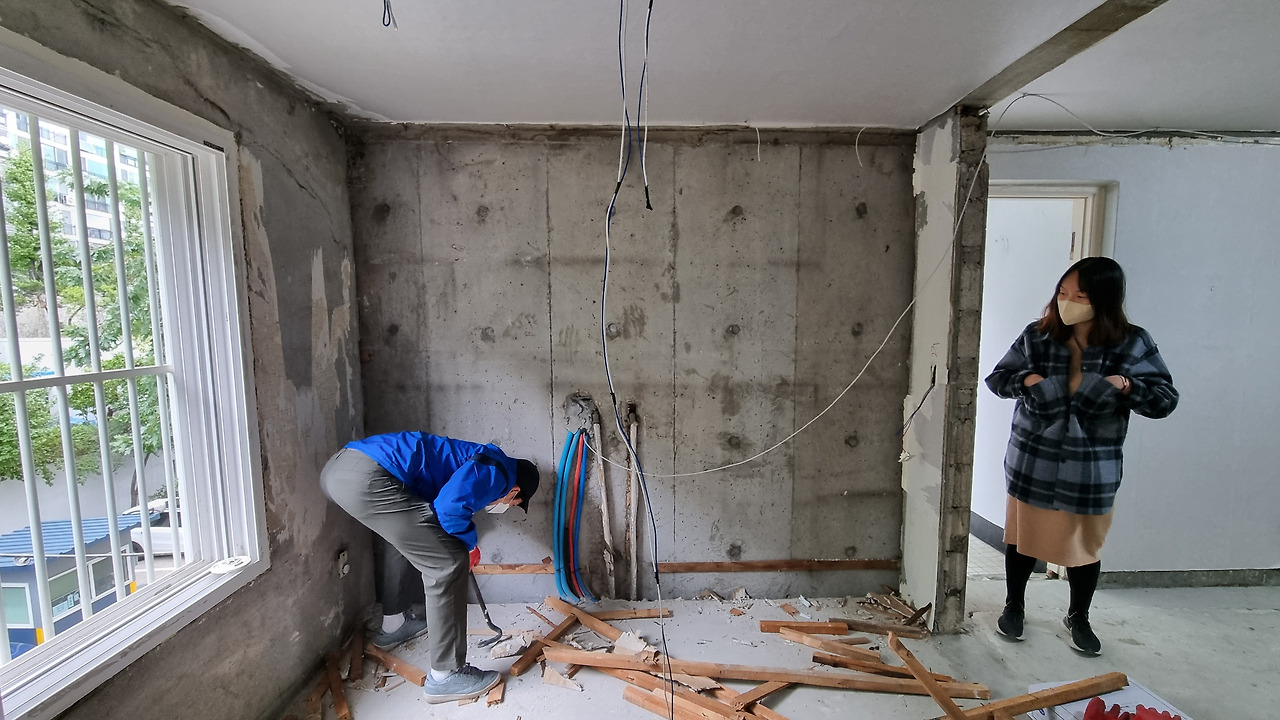 우리 현장처럼 별도의 가벽 없이 콘크리트 벽에 벽지로만 마감되어 있는 집은 전선의 경로나 콘센트 스위치 등이 모두 노출돼 있다. 전선을 빼두는 작업이 끝나면, 후공정인 목공 기술자에게 석고 가벽을 설치한 후 가벽 밖으로 전선을 빼달라고 주문해두면 된다. 그러면 전선은 가벽 밑으로 매설돼 깔끔하게 마감된다.