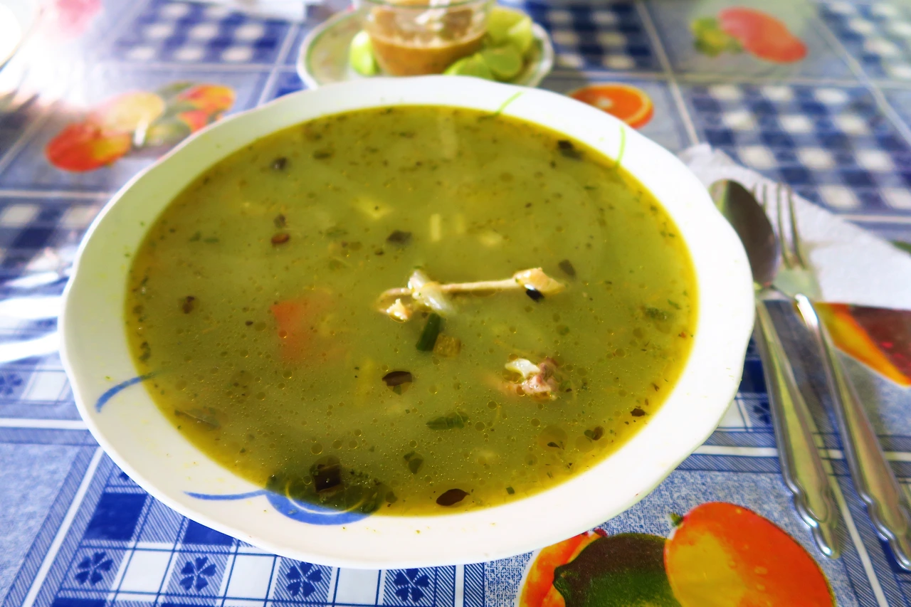 싼값도 싼값인데, 나름의 애피타이저로 정체 모를 뼈가 둥둥 떠있는 초록색 수프가 내 앞에 놓여졌다.