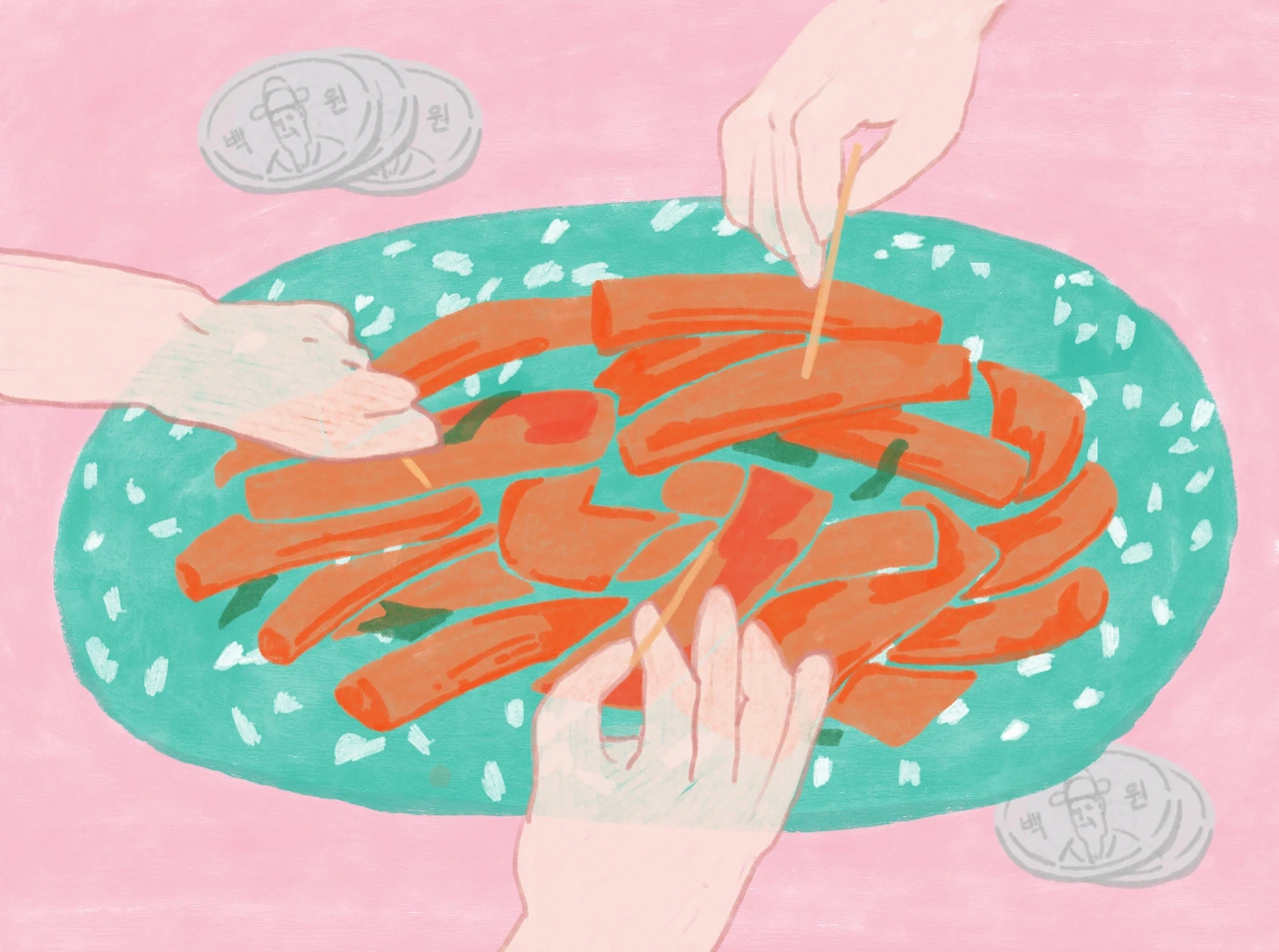 집에 가면 바로 저녁을 먹겠지만 배도 고프고 돈도 덜 받는 데다 방방 주위를 강렬히 맴도는 떡볶이의 냄새는 안 먹고 지나갈 수 있는 강인한 의지력의 꼬맹이들은 없었을 것이다.