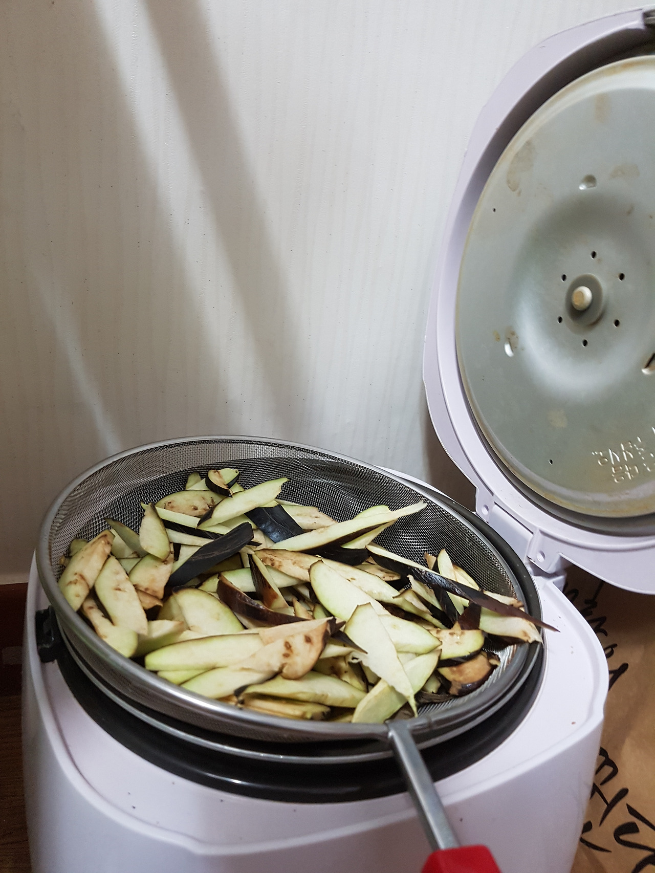 몸에 열성이 많아서 그런가싶어 냉한 성분인 가지를 먹기로하고 나머지는 차를 만들기 위해 전기밭솥에 체를 올려 거기다 가지 썰어 놓은것을 말리는 중이다. 보온만 가능한 고장난 전기밭솥을 이용한다.