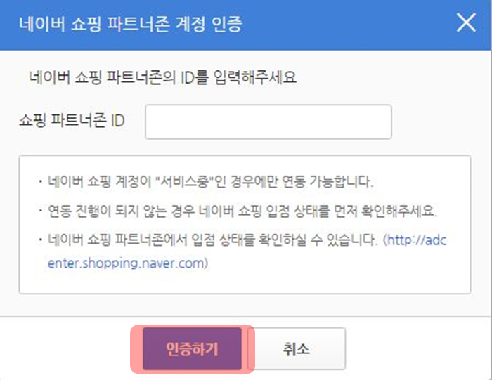 해당 창에 쇼핑 파트너 존 ID/스토어팜 ID를