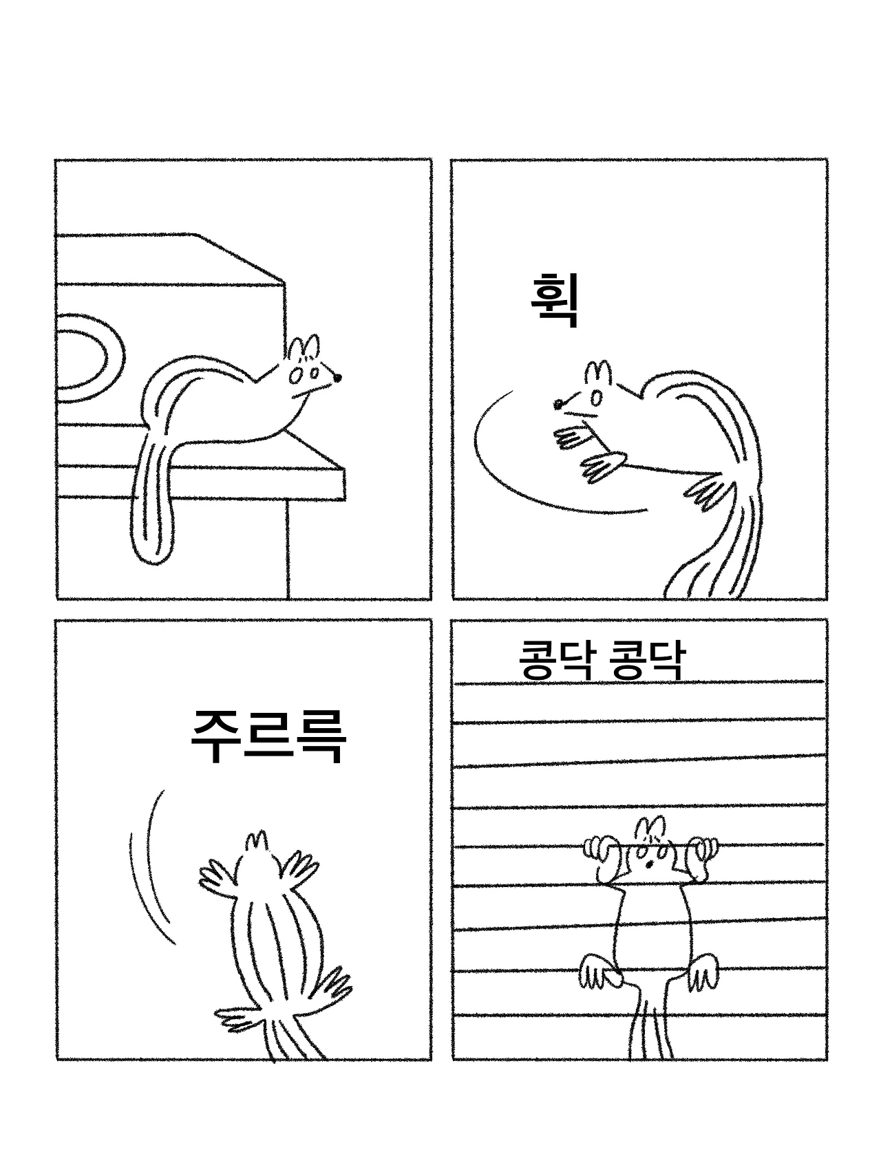 은신처에서 나오다가 발을 헛디뎌 떨어질 빤했다. 작은 몸이 얼마나 놀랐는지 콩닥콩닥 하는 게 눈에 보일 정도였다. 다치지 않아서 다행이야.
