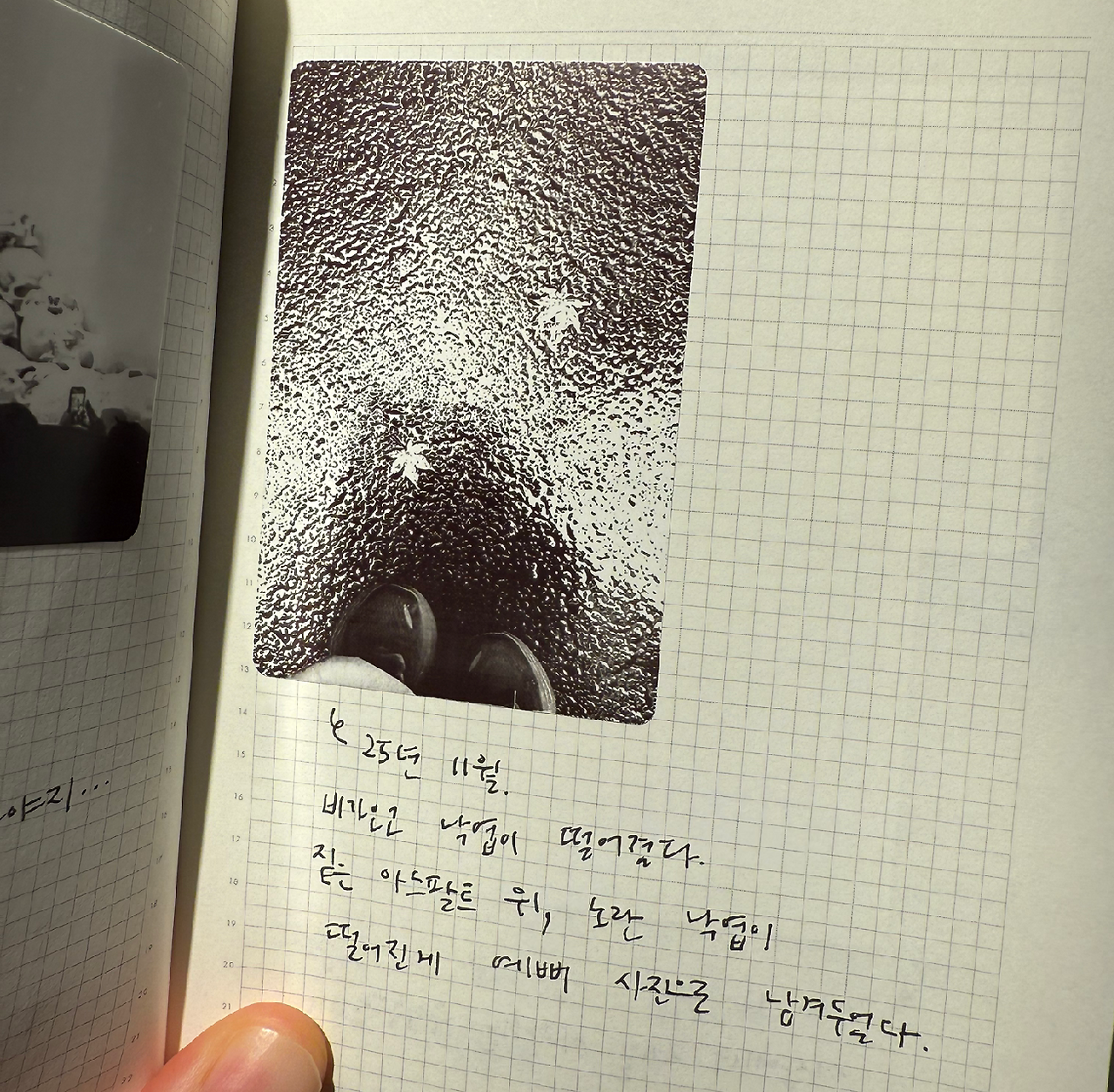 그래서 그날부터 일기를 다시 쓰기 시작했다. 즉석 사진기를 중고로 구매해, 매일 하루 한컷을 찍고 다이어리에 붙여가며 일기를 쓴다. 또 새로운 방식으로 쓰는 일기라 그런지 재미있다. 설레는 일이 좀처럼 없었는데, 요즘엔 그 사진 일기에 어떤 순간을 포착해서 담을지 거리 곳곳을 유심하게 살펴보게 된다. 이게 좀 재미있다.