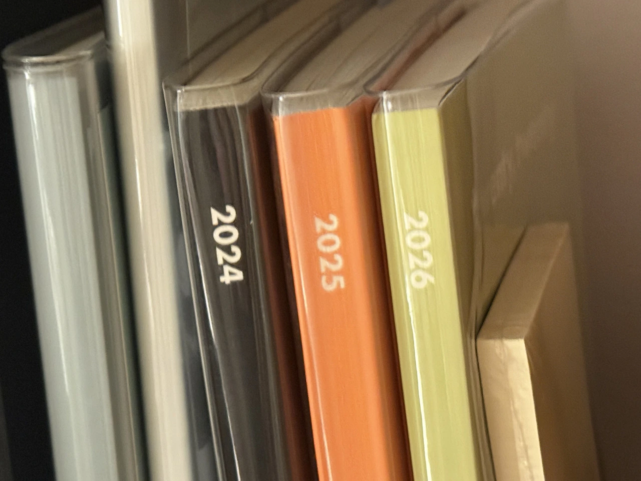 그러다가 얼마 전, 책장에 꽂혀있는 2026년 다이어리를 발견했다. 24년도부터 함께 다이어를 샀던 동료, C와 공동구매한 다이어리다. *현재는 모두 퇴사해 각자 다른 곳에 있지만 이번에도 다이어리를 공동구매했다.* 그래! 이게 있었네. 26년 다이어리를 열어보았다. 빳빳한 종이 감촉이 오랜만이었고, 반가웠다. 그런 김에 24년도와 25년도 다이어리를 열어보았다. 올해는 8월 이후에 거의 다이어리를 쓰지 않았다. 하지만 앞쪽은 빽빽했다. 매일 감사했던 일을 쓰기도 하고, 활용하기 좋은 영문장을 쓰기도 했다. 그날그날 먹은 것과 운동에 대해서도 꽤 상세히 적어두었다. 퇴사를 고민하던 시기의 일기, 여기저기서 사모으던 귀여운 스티커들이 눈에 들어왔다. 24년도 다이어리도 마찬가지다. 조금 소원한 날도 있기야 했지만 매일 나를 써 내려갔다.