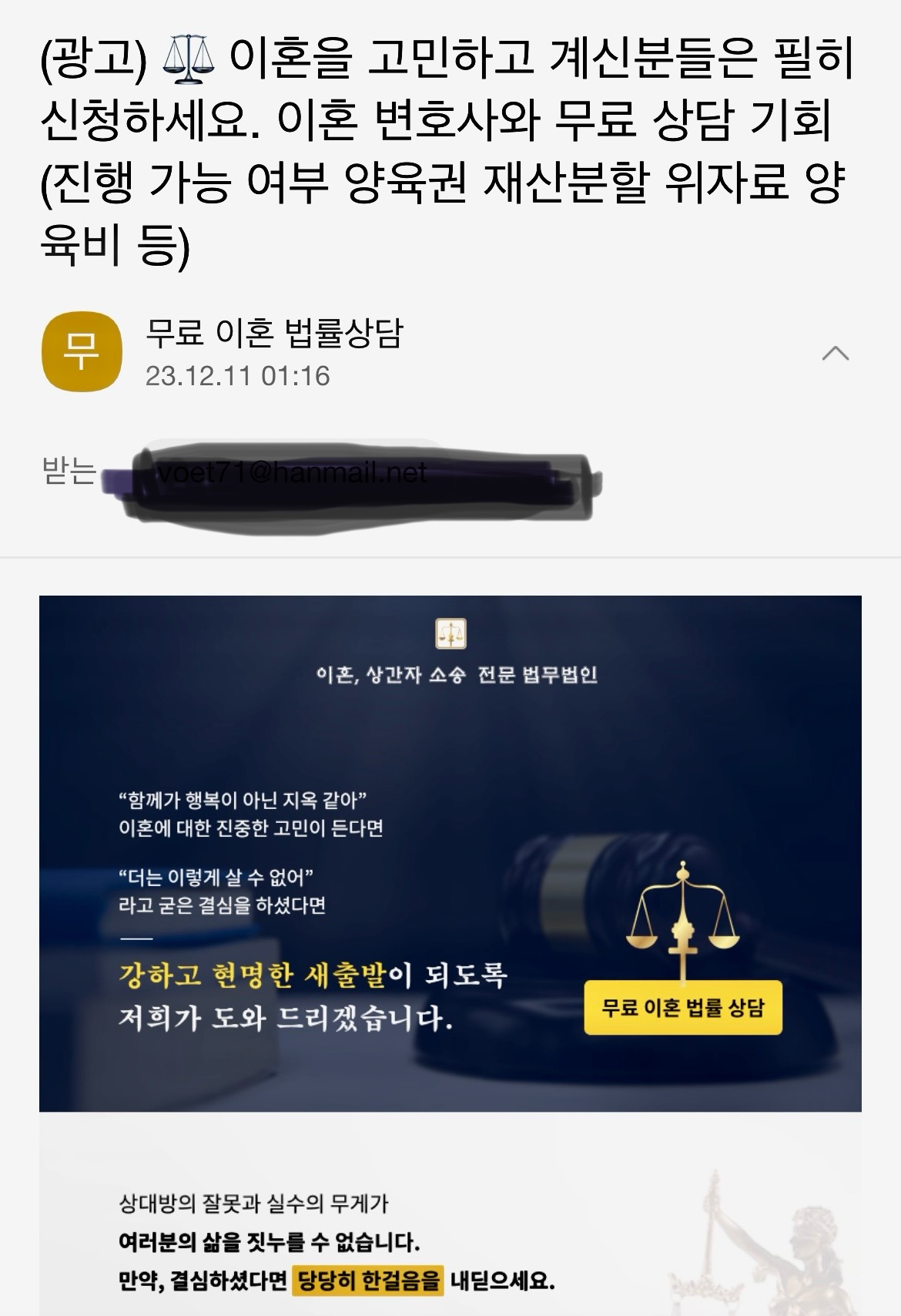 얼마 전부터 무료 이혼법률 상담 스팸 메일이 오기 시작했다. 열어 보지도 않고 당연히 삭제했었고, 스팸 메일로 이동시키는 것도 귀찮아서 그냥 놔뒀었다.