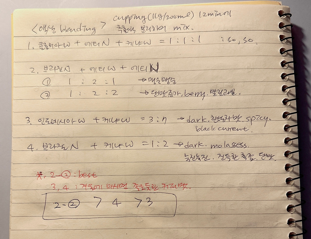 먼저, 액상 커피 블랜딩 계획을 써 내려갔다.