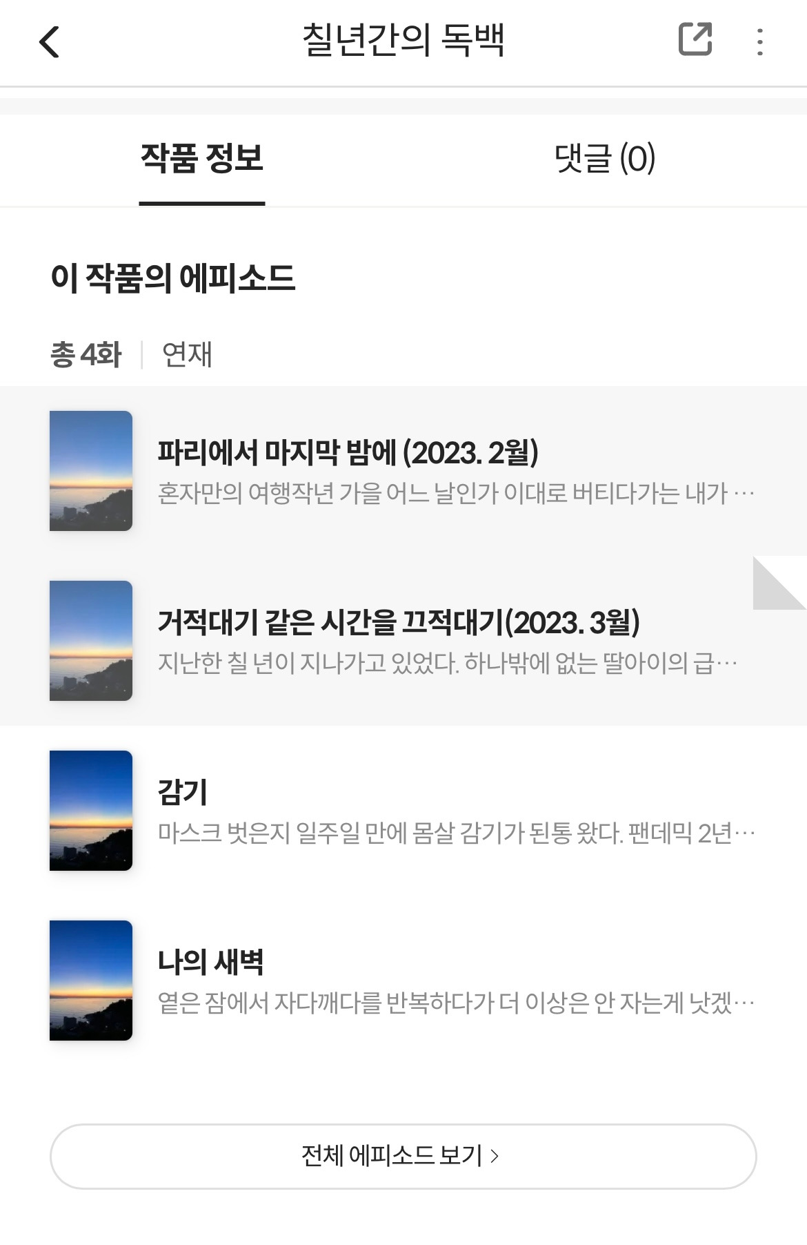 브런치북에 실었던 글들을 수정하여 밀리로드에 연재할 예정입니다. 오늘까지 총 4편을 업로드 하였습니다. 관심 있으신 분들은 저의 첫 브런치북 <무겁게 그래서 더 가볍게>와 비교해서 말씀해 주시면 감사하겠습니다.