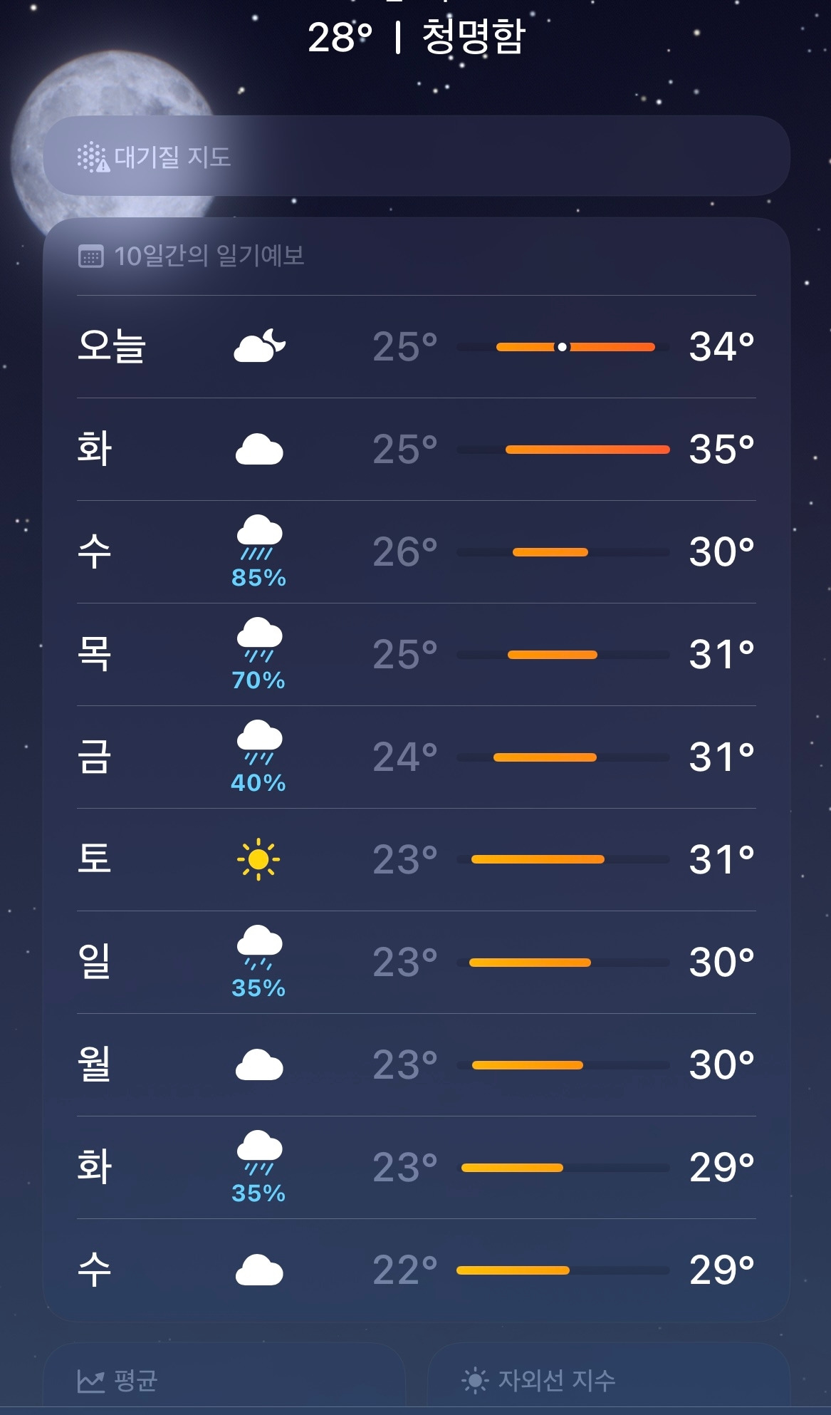 이 시간까지 아직도 덥다. 그래서 날씨앱을 열어봤더니 반가운 비소식이 며칠 있다. 다음주 화요일이나 되어야 30도 이하로 떨어진다고 나온다.